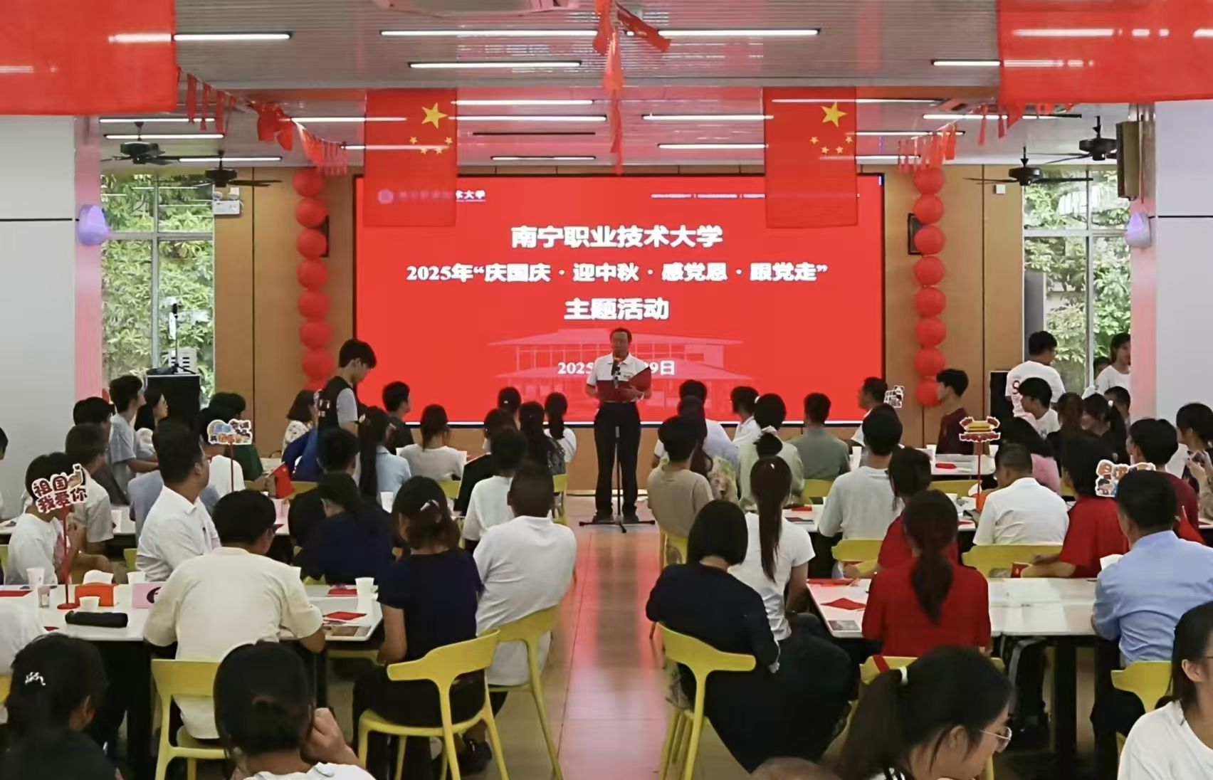 蹇兴超在致辞中,代表学校党委向在场的每一位老师和同学致以最热烈的节日问候和最美好的祝愿。他指出,中秋的团圆意蕴,是中华民族重视家庭、家国同构的生动体现,国庆的庄严时刻,更是回望奋斗历程、凝聚民族力量的精神坐标。今年以来,学校紧紧围绕“双高计划”建设和职业技术大学发展目标,在人才培养、科技创新、产教融合等方面取得了一系列令人振奋的成绩。这些成绩的取得,凝结着全体师生的智慧与汗水,更离不开国家对职业教育的高度重视和对青年学生的悉心关怀。学校通过发放奖学金、修缮学生宿舍、改造热水系统、下调直饮水价格、升级改造学生食堂等一系列举措,努力提升校园生活品质,让每一位同学都能在南宁职大感受到家的温暖。