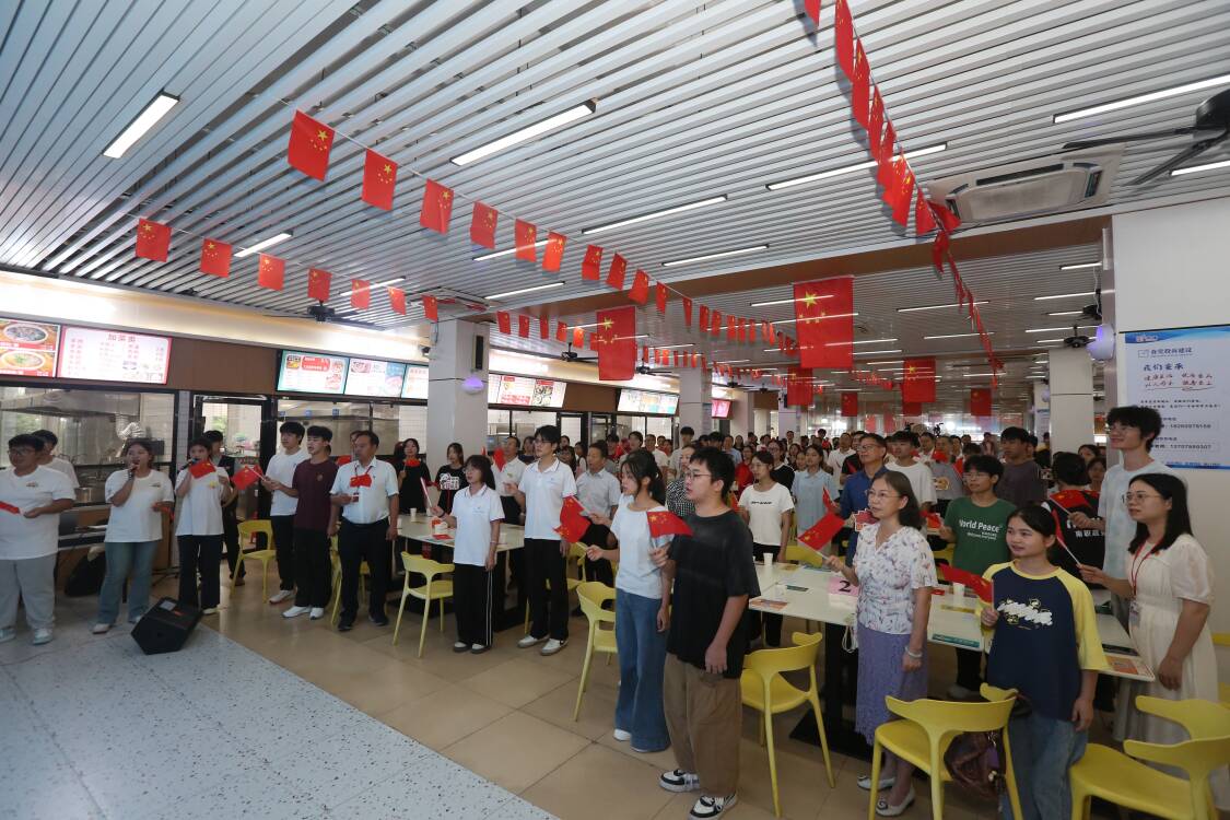 “今日中国巍然屹立傲视四方,民族复兴的使命正由我们担当……”活动现场,学生代表深情朗诵经典篇目《这盛世如您所愿》,抒发了对中国日益强盛的由衷赞叹。教师代表共同唱响《今天是你的生日》,传递出对祖国的深切祝福。现场气氛热烈,全体校领导与师生代表一同挥舞国旗,齐声高歌《歌唱祖国》等歌曲,以激昂的歌声共同表达对祖国繁荣富强的美好祝愿。活动最后,全体师生一起共进晚餐,大家共叙教学日常,现场氛围其乐融融。