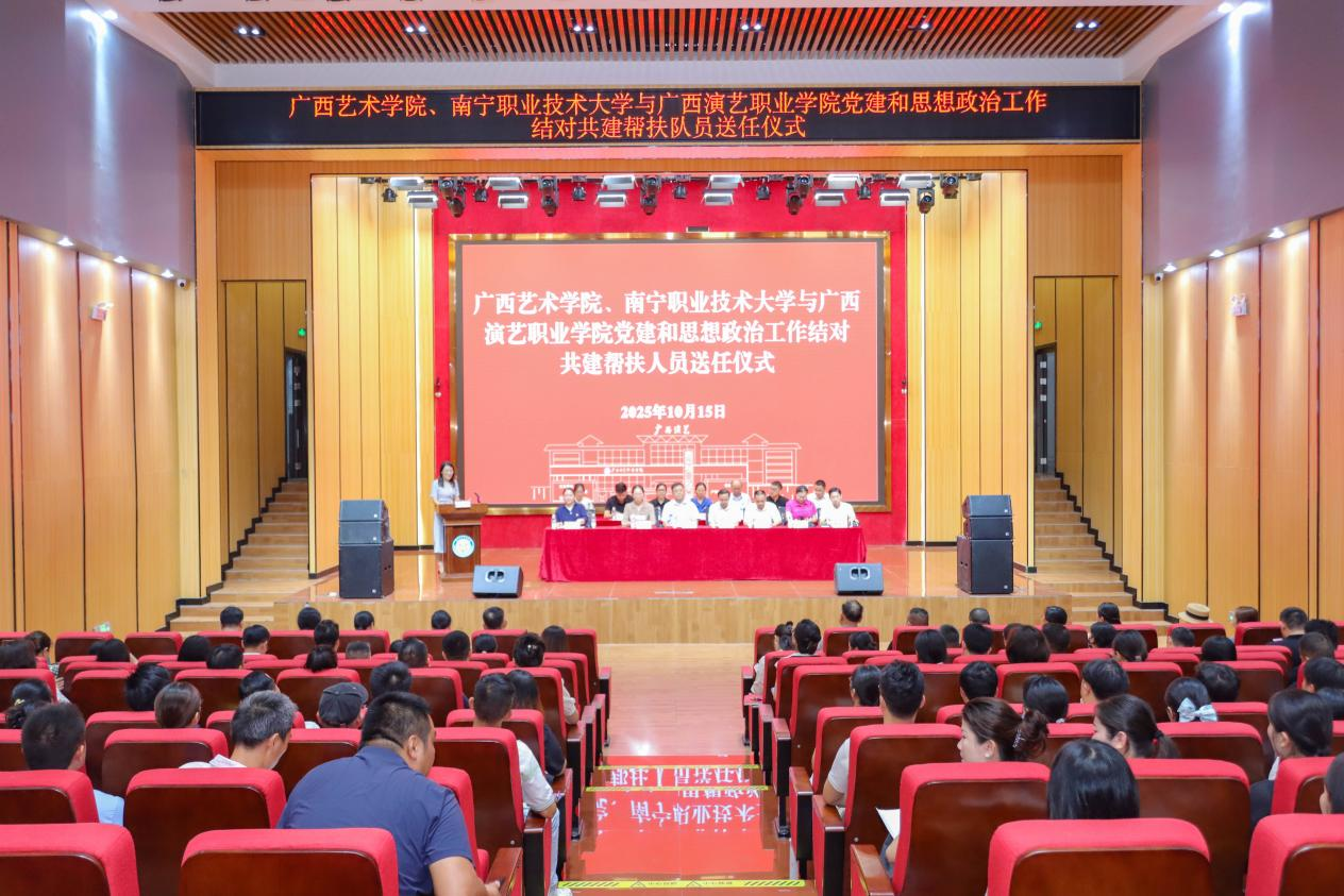 为贯彻落实自治区党委教育工委关于公办高校与民办高校党建及思想政治工作结对共建的工作部署,充分发挥公办高校在党建和思想政治工作中的示范引领作用,推动民办高校党建与思想政治工作质量提升,10月15日上午,太阳成集团tyc7111cc、广西艺术学院与广西演艺职业学院党建和思想政治工作结对共建帮扶队员送任仪式和帮扶工作研讨会在广西演艺职业学院举行。学校党委书记蹇兴超,广西艺术学院党委副书记毛茂林及广西演艺职业学院党委书记潘登斌参加本次活动。