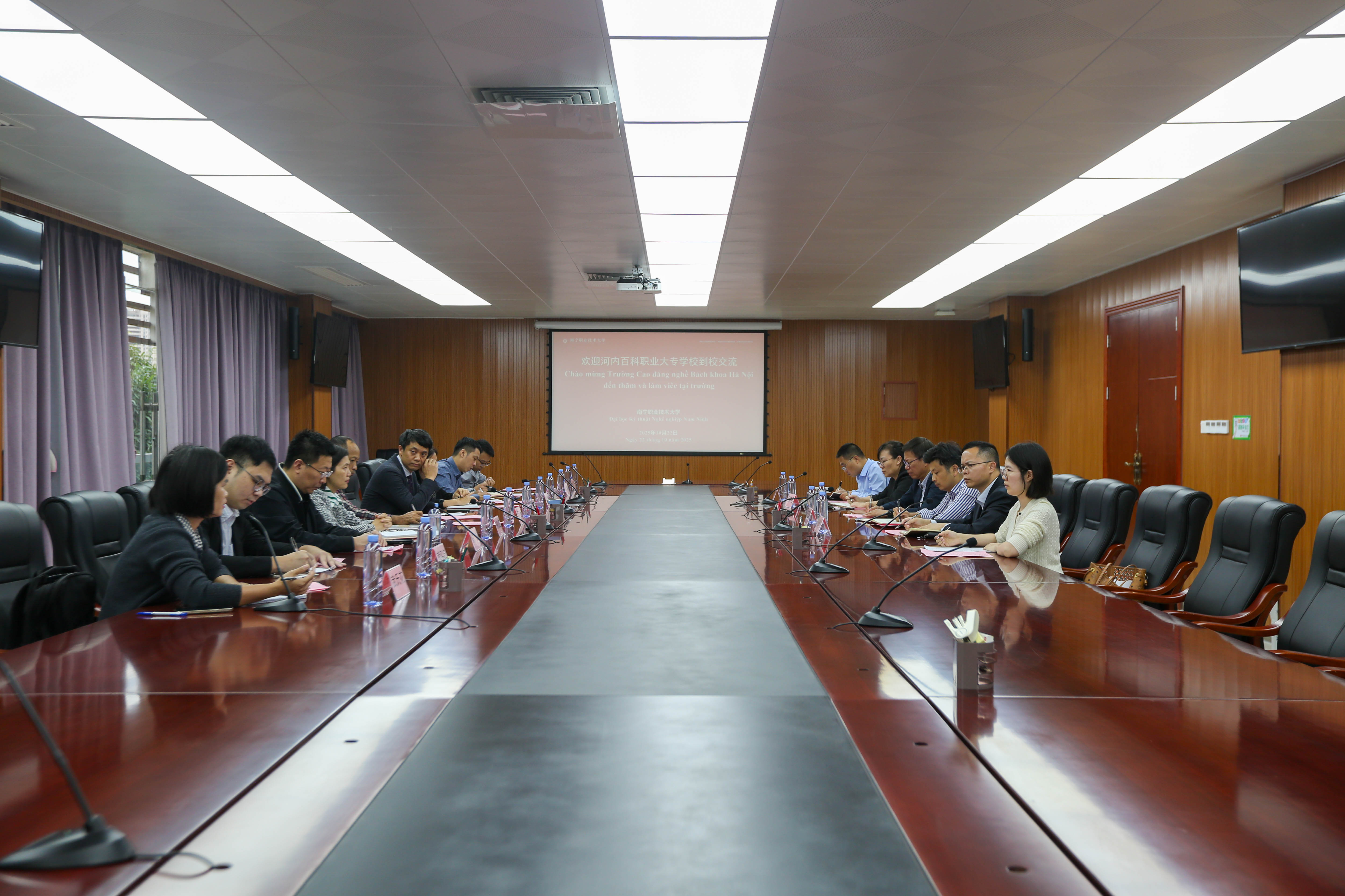 周旺对代表团的到访表示热烈欢迎,简要介绍了太阳成官网的办学理念、学科布局、国际交流合作成果及未来发展愿景,并表示期望双方依托各自优势教学资源与实训平台,携手培养适应中越产业发展需求的高素质技能人才。会上,双方围绕合作办学具体事项展开深入研讨,就合作方向达成广泛共识,并进一步明确了下一步工作推进举措。