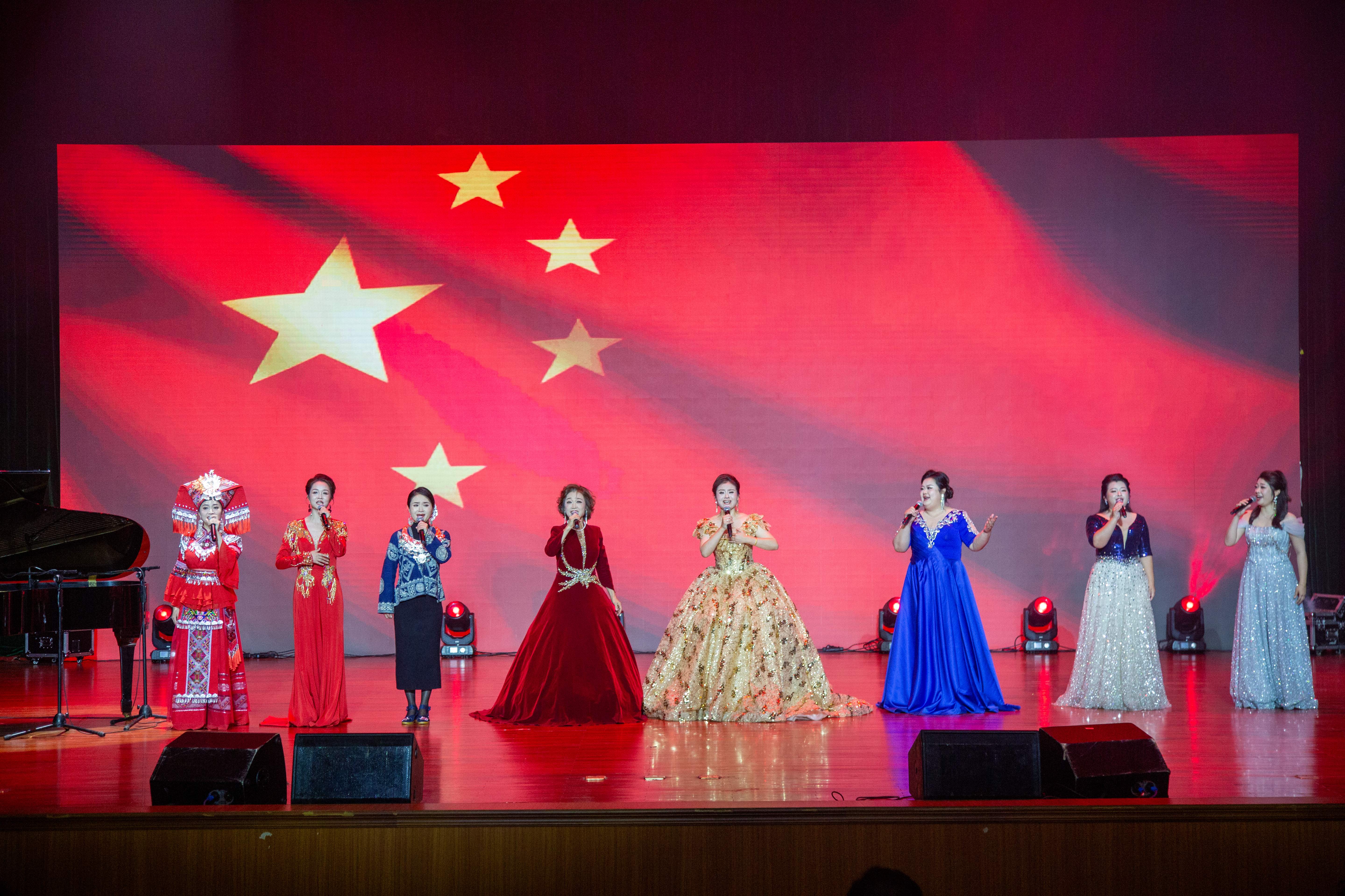 金北凤教授(左四)领唱《我爱你中国》(南职融媒/摄)