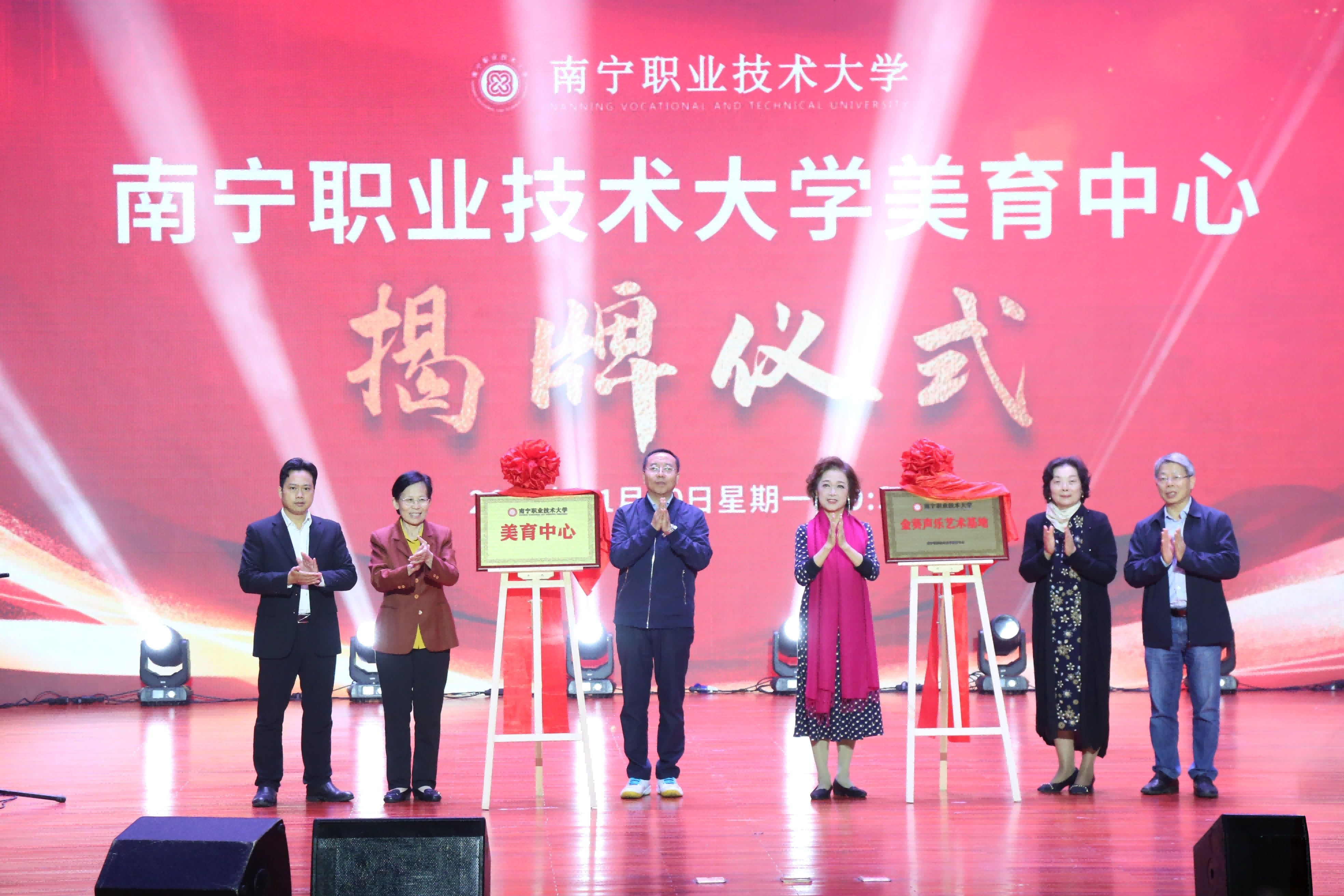 蹇兴超在致辞中指出,习近平总书记提出的“要全面加强和改进学校美育,坚持以美育人、以文化人,提高学生审美和人文素养”,为高校美育工作指明了方向。党的二十届四中全会明确提出“激发全民族文化创新创造活力,繁荣发展社会主义文化”,为我们深化美育工作提供了根本遵循。近年来,国家和广西先后出台系列部署要求,为高校美育发展搭建了坚实平台。作为广西高职教育的排头兵,学校始终把美育作为人才培养的重要环节,自觉扛起传承中华优秀传统文化、培育时代新人的使命担当。近年来,学校通过开展系列活动、打造相关平台,实现将美育与专业教学、社会责任相结合,推动美育资源国际化交流,促进美育与科技创新、产业升级联动。学校美育中心揭牌成立后,将整合校内外资源,构建以艺术课程为基础、以实践活动为支撑、以校园文化为载体的美育体系,结合学校“面向东盟开放办学”的特色与优势,融汇国际视野,探索美育交流互鉴的新模式,打造具有南宁职大特色、体现职业教育类型特点的美育品牌,让美的创造为校园文化注入新的活力与深厚内涵,并引导师生创作出更多AI+美育的优秀作品,为扎实推进文化强国建设贡献职教力量。