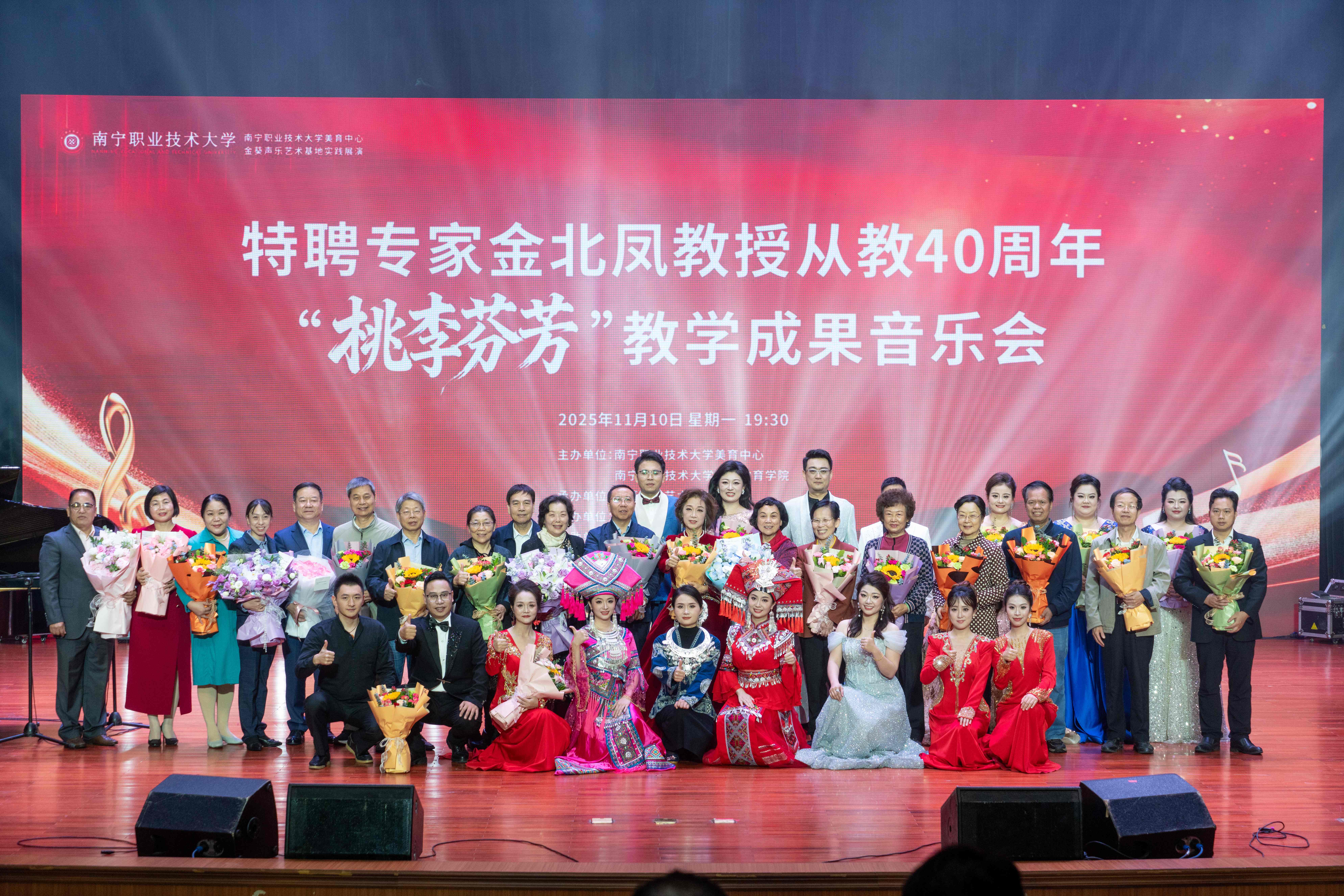 音乐会上,金北凤教授与来自广西大学、广西民族大学、广西艺术学院等院校的优秀学生联袂演出,带来《我爱你中国》《乌兰巴托的夜》《领航》等15首大家耳熟能详的经典歌曲,尽展师徒相继、艺术传承的动人风采,现场掌声雷动,高潮迭起。大家纷纷表示,此次 “揭牌仪式 + 成果展演” 的创新形式,既彰显了学校以美育人、以文化人的教育追求,也为区域美育资源共享提供了鲜活范例。