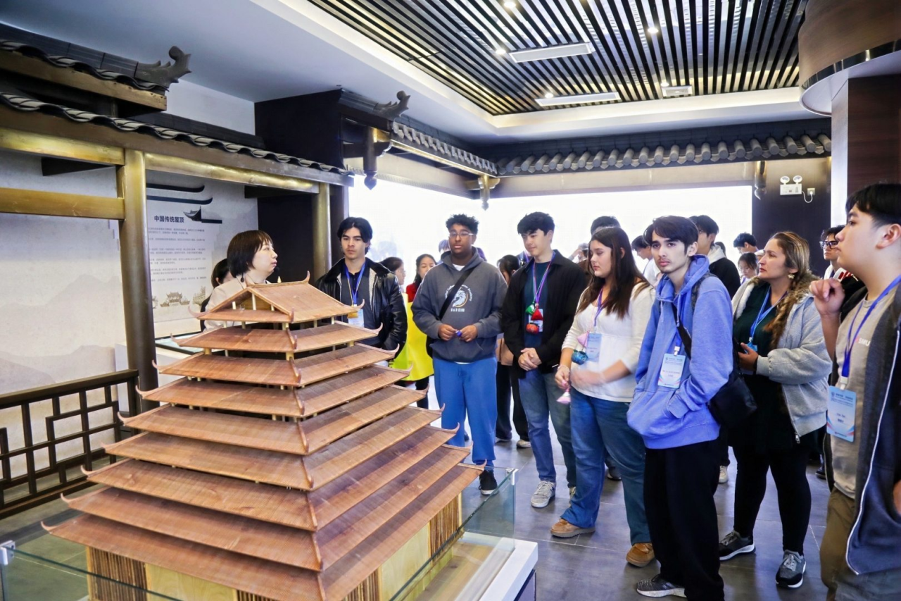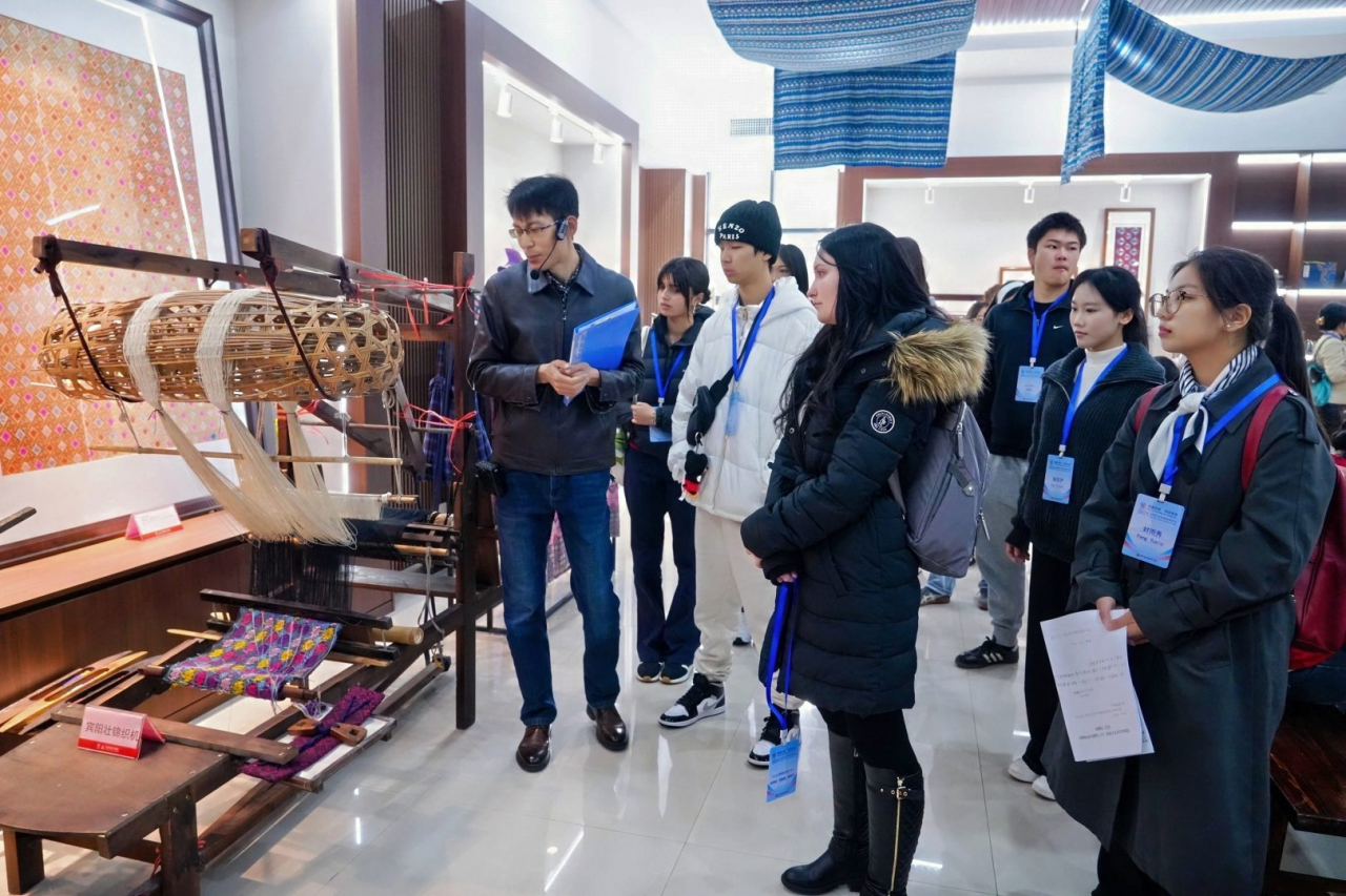中美青年学生在艺术与传媒学院了解壮锦编织技艺