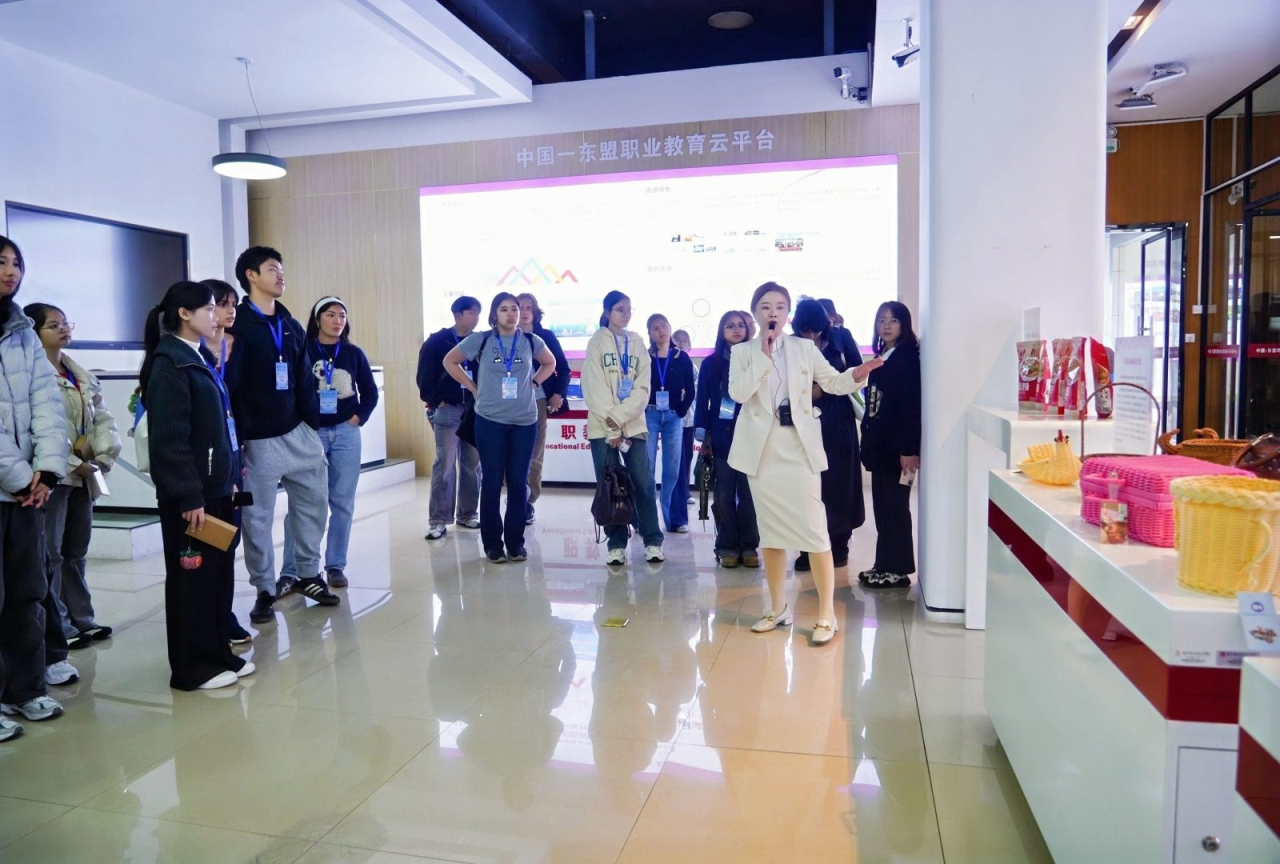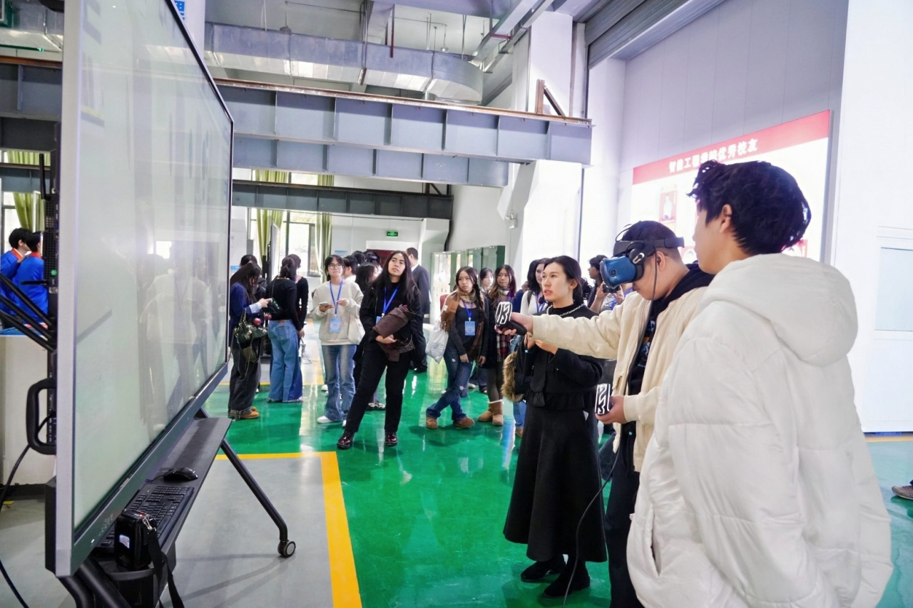 中美青年学生首先来到人工智能学院,详细了解最新的机器人技术,观摩人形机器人搬运箱子以及机器人训练过程,并亲自体验机器狗操作,切身感受人工智能带来的科技变革。在智能工程学院,学生们通过VR设备沉浸式体验虚拟智能制造工厂产线交互流程,并动手参与3D打印产品制作,近距离感受职业教育与前沿技术融合的创新成果。艺术与传媒学院则展示了国家级非遗“壮族织锦技艺”,学生们在老师指导下亲手缝制寓意吉祥的“柿柿如意”壮锦挂件,参观民族团结进步长廊,深入感受广西各民族文化的丰富内涵。在智慧城市学院,民族建筑博物馆的展陈生动呈现了广西不同时期的建筑风格与演变历程。在数字经济学院的中国—东盟跨境电商大数据协同创新中心,学生们亲手制作茉莉茶香包、调制茉莉奶茶,并化身“跨境主播”模拟直播带货,体验数字经济时代的商贸新形态。