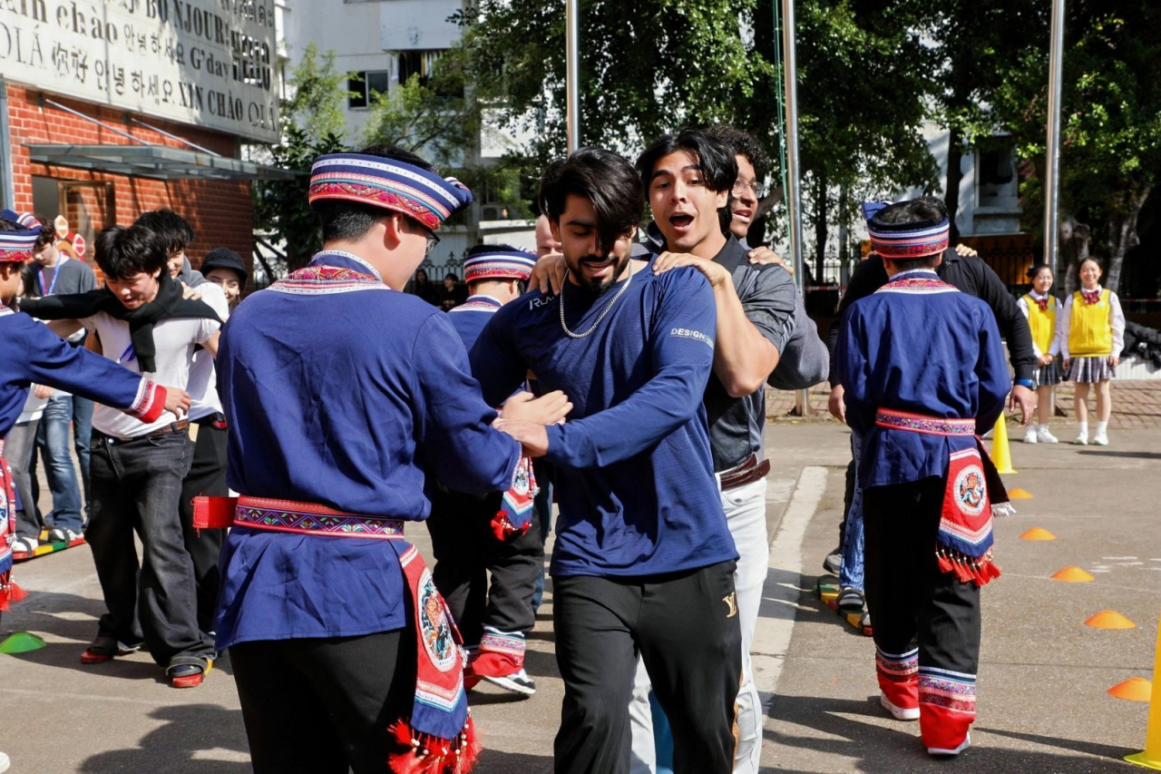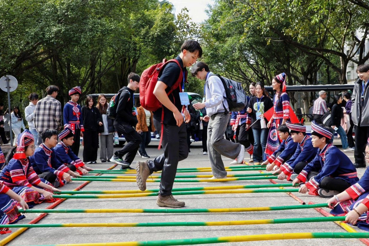 为了欢迎远道而来的客人,一场充满壮乡风情的民族体育展演在东盟广场精彩上演。在主持人热情带领下,学生们踊跃参与,先后体验了节奏欢快的竹竿舞、协作奋进的板鞋竞速、趣味盎然的壮族背篓绣球等传统项目,并观摩了刚柔并济的民族健身操与古朴雄健的古壮拳表演,在互动欢笑中迅速拉近彼此距离。