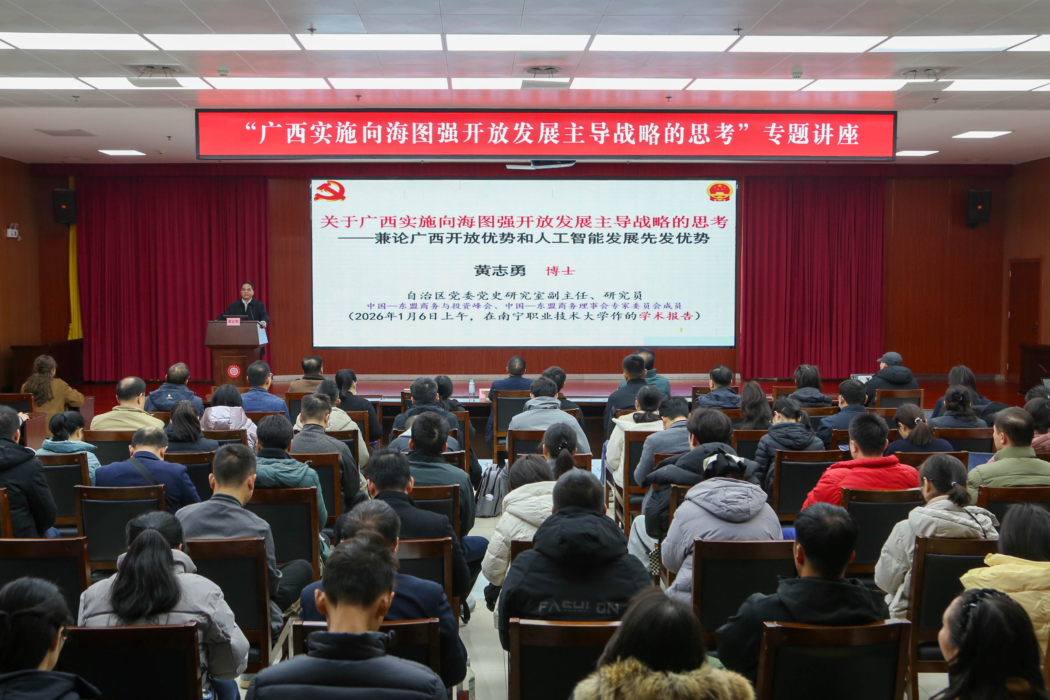 为深入贯彻党的二十届四中全会和自治区党委十二届十一次全会精神,1月6日上午,自治区党委党史研究室副主任、研究员黄志勇博士受邀到太阳成官网作题为“关于广西实施向海图强开放发展主导战略的思考——兼论广西开放优势和人工智能发展先发优势”的专题讲座。讲座由学校党委书记蹇兴超主持,学校党委常委、副校长王凤岭及200多名教师到场听专题讲座。