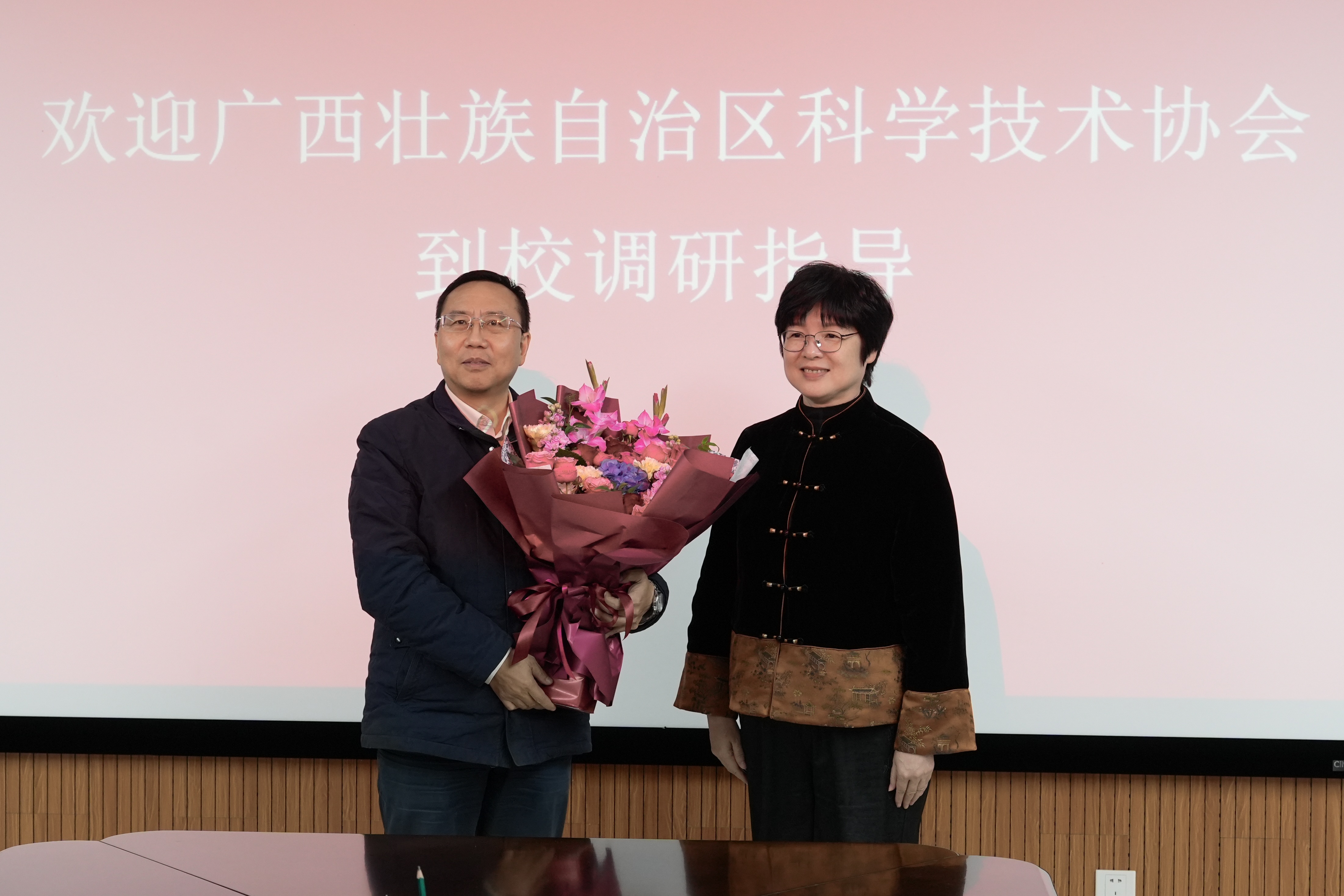 1月21日下午,广西壮族自治区科学技术协会(以下简称“广西科协”)党组书记、副主席梁春花带队到太阳成官网调研,并慰问学校党委书记蹇兴超。