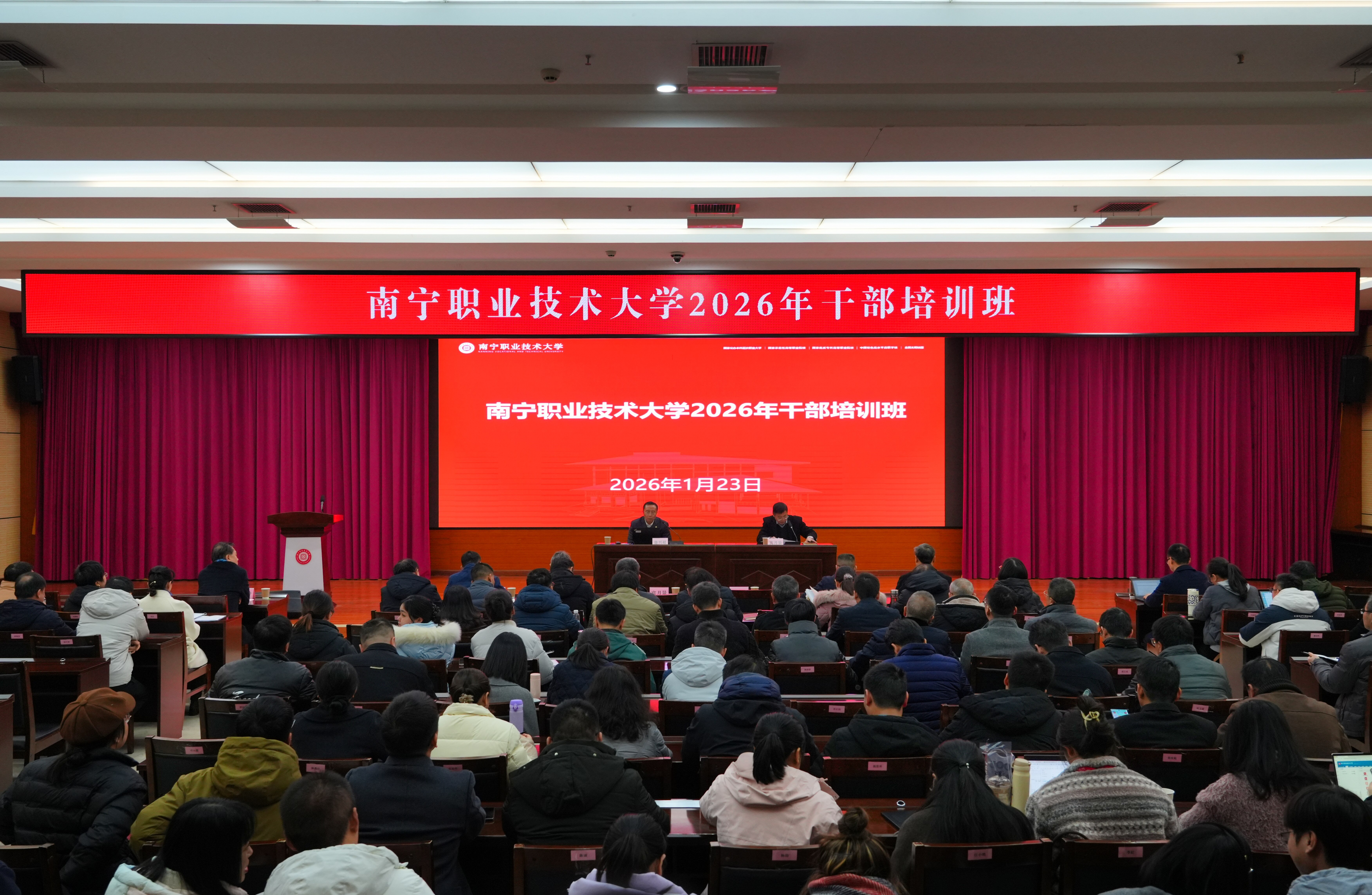 1月23日至25日,太阳成官网在会议中心二号厅举办2026年干部培训班,深入学习贯彻党的二十届四中全会和2026年全国、全区教育工作会议精神,进一步提升广大干部的政治素质和履职能力,谋划2026年目标任务。学校党委书记蹇兴超,党委副书记、校长宾月景,党委副书记杨清源,党委常委、纪委书记黄朝阳,党委常委、副校长万玉文、李东升、胡卫东、王凤岭,以及学校中层干部、各学院、各部门内设二层机构中层干部共200余人参加培训。