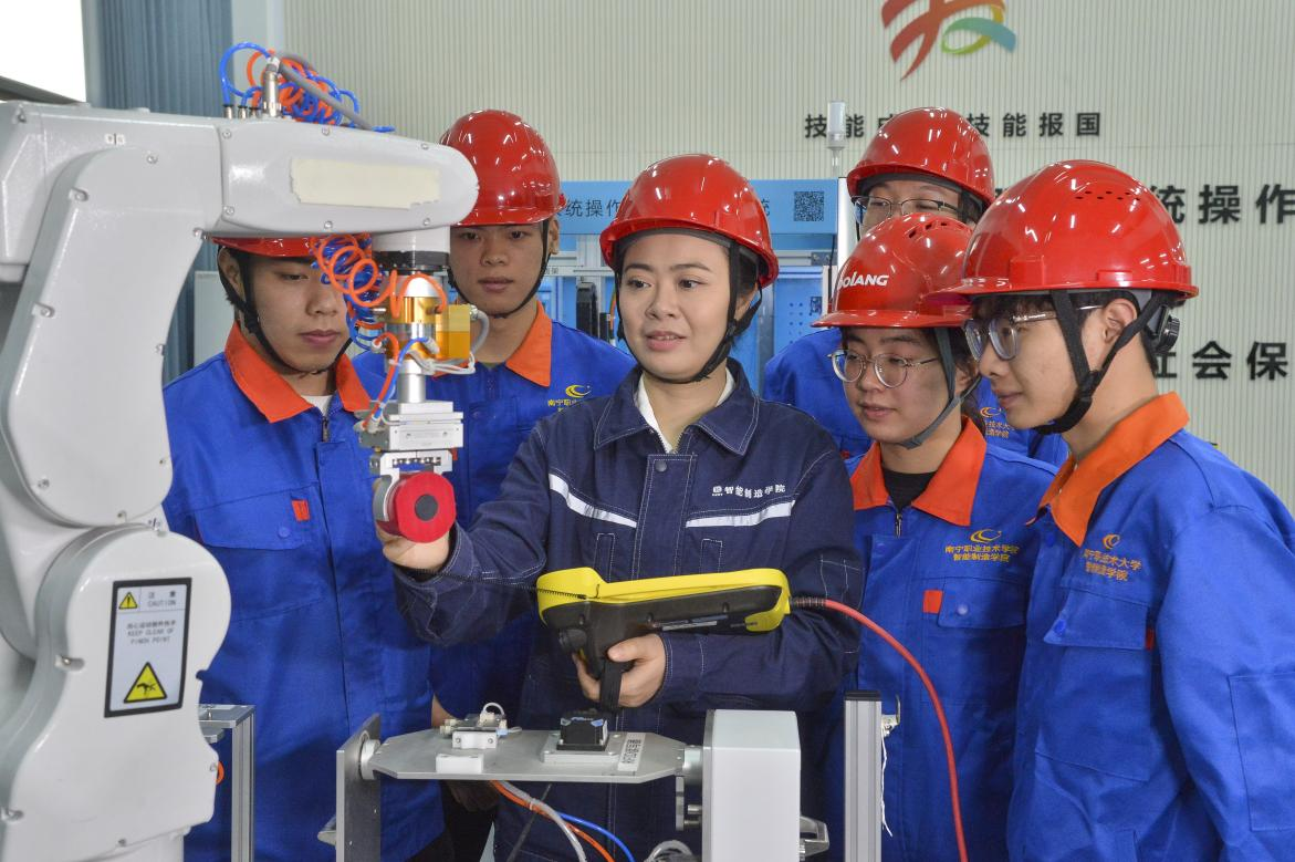 作为新时代职教战线的优秀代表,黄宇婧认真落实立德树人根本任务,深耕教学科研、育人管理与服务师生一线,曾获2023年中华人民共和国第二届职业技能大赛工业机器人系统操作赛项银牌,实现了广西选手在该项国家级赛事中的历史性突破。黄宇婧作为自治区级全国技能大赛工业机器人系统操作项目集训基地和自治区级技能大赛工作室(工业机器人系统操作员S工种)领办人,深度参与了国家级教学资源建设,主持开展多项技术攻关,领衔的智能制造创新团队成功获评第三批“广西青创空间”,为区域产业升级注入了蓬勃的青春动能。