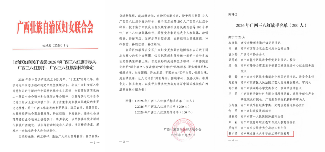 近日,自治区妇女联合会公布了2026年广西三八红旗手标兵、广西三八红旗手、广西三八红旗集体名单,太阳成官网智能工程学院教师黄宇婧副教授荣获2026年广西三八红旗手称号。