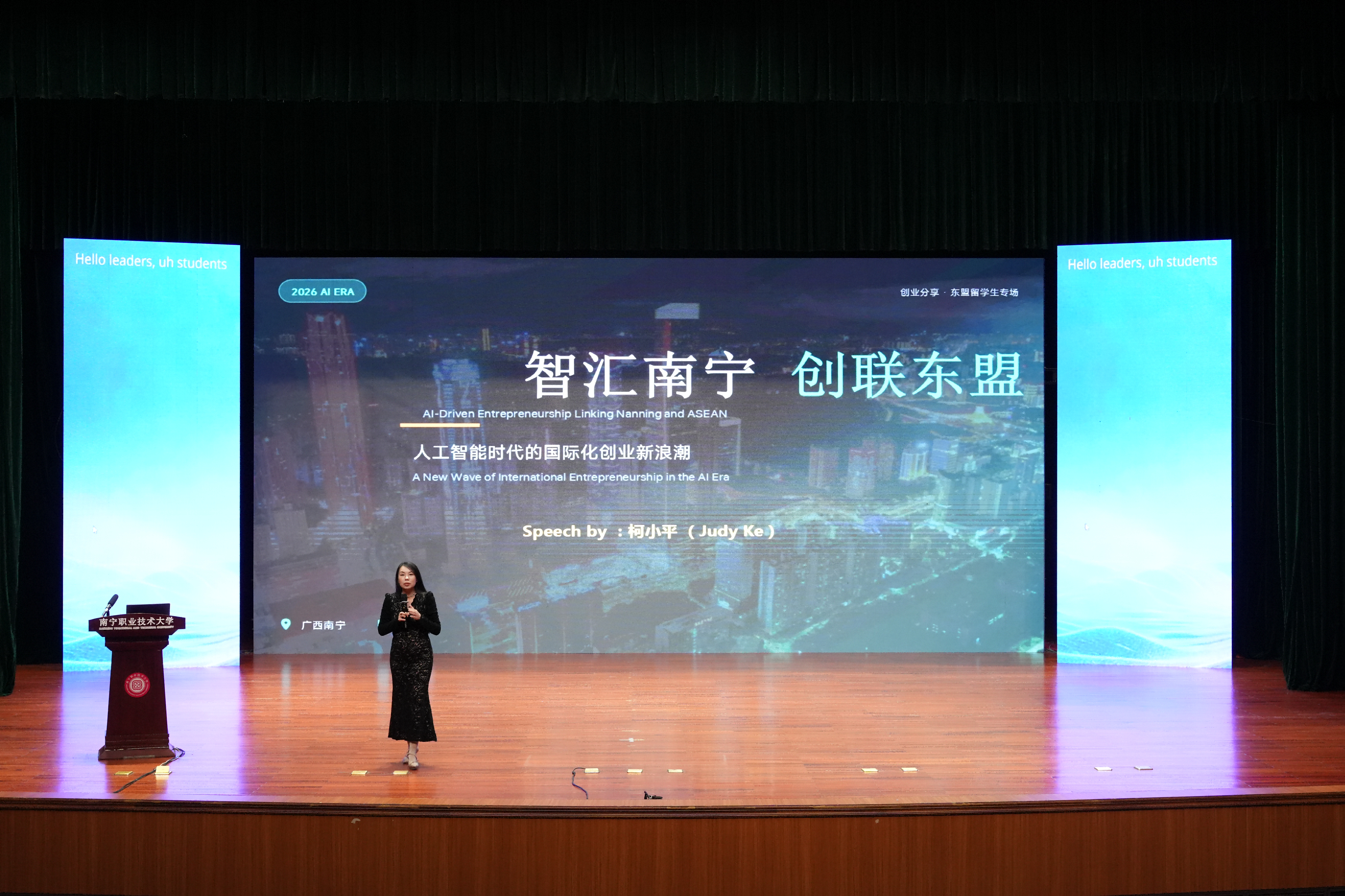 宾月景在致辞中表示,学校始终立足南宁面向东盟的区位优势,积极推动人工智能领域的产教融合与国际合作,此次宣讲会既是落实南A中心建设要求的具体行动,也是学校服务地方产业发展、培育国际化人工智能人才的重要举措。柯小平围绕人工智能领域创业成才主题开展专题授课,结合自身跨境创业经验,分享了人工智能产业在东盟市场的发展机遇、创业路径与实践要点,并现场解答参会人员的提问。宋尉就南A中心东盟谷的建设规划、产业布局、扶持政策等内容进行详细推介,让参会者全面了解南宁面向东盟发展人工智能产业的核心优势与发展前景。