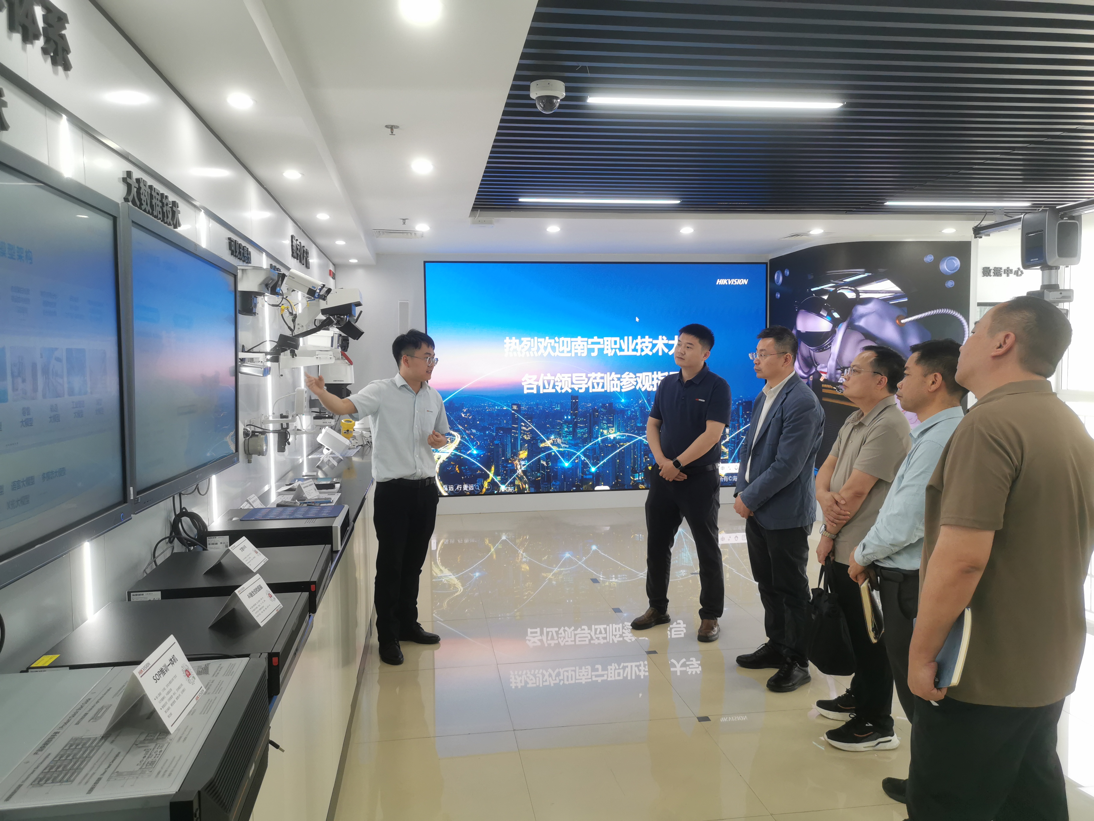 为深化校企协同育人,推动数智技术与学校专业建设深度融合,4月1日,学校党委副书记、校长宾月景带队赴海康威视考察交流。海康威视广西业务中心总裁袁海涛热情接待宾月景一行。