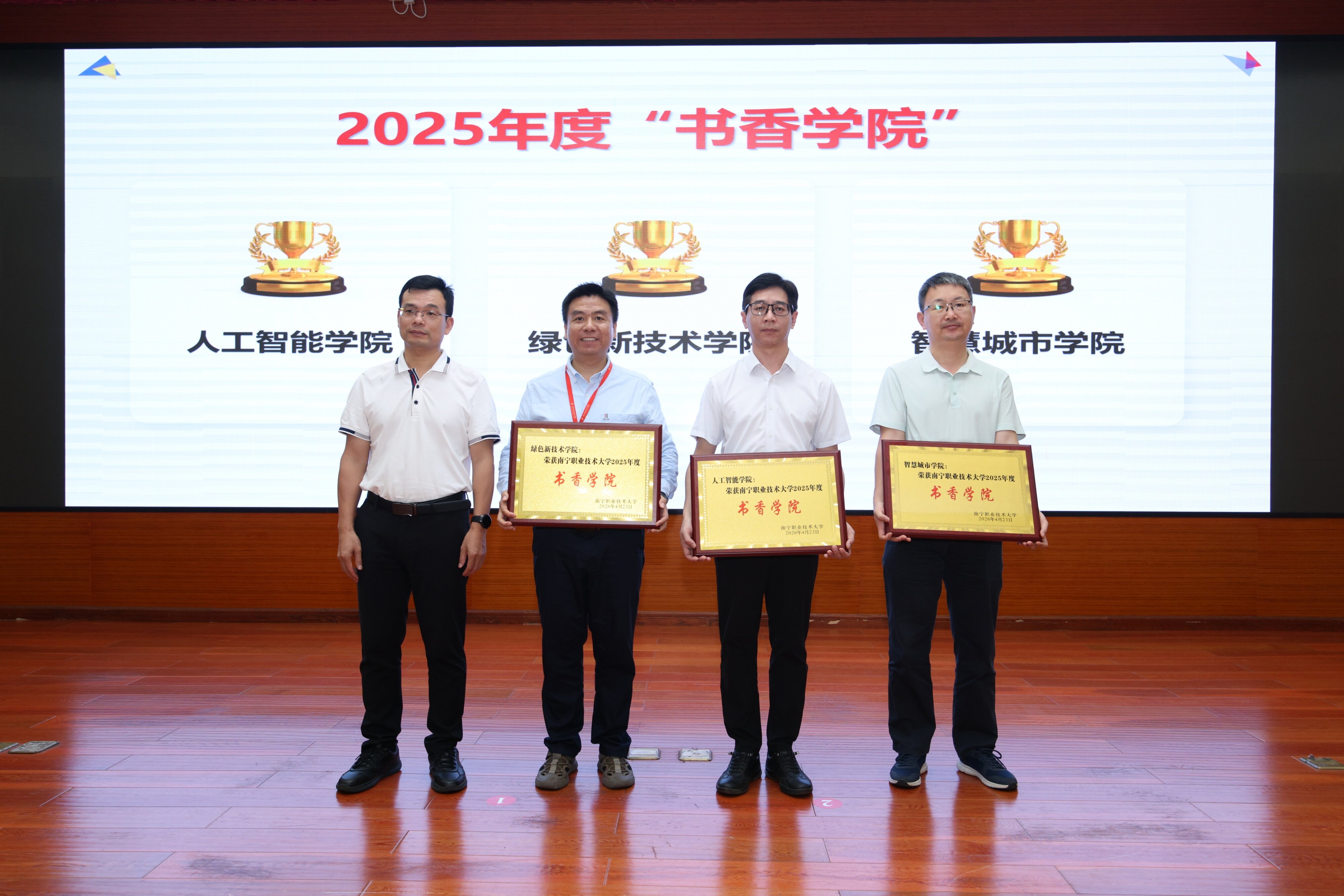 现场还发布了《太阳成集团tyc7111cc2025年度阅读工作报告》,并对2025年度在阅读推广工作中表现突出的先进集体和先进个人进行了表彰。人工智能学院、绿色新技术学院、智慧城市学院获评“书香学院”;徐缘等10名辅导员获评“书香辅导员”;25级软件工程3班等10个班级获评“书香班级”;刘红艳等5名教师获评“书香教师”;王乐英等30名学生获评“书香学子”。李东升为“书香学院”“书香辅导员”获奖代表颁奖并合影留念。“书香学院”获奖代表、人工智能学院党委书记陆军,“书香辅导员”获奖代表、数字经济学院辅导员覃维湘,“书香教师”获奖代表、智慧城市学院教师张龙,“书香学子”获奖代表、国际学院学生甘露分别作了经验交流与阅读分享,展现了南职师生“以书为梯、以学促教”的良好风貌。