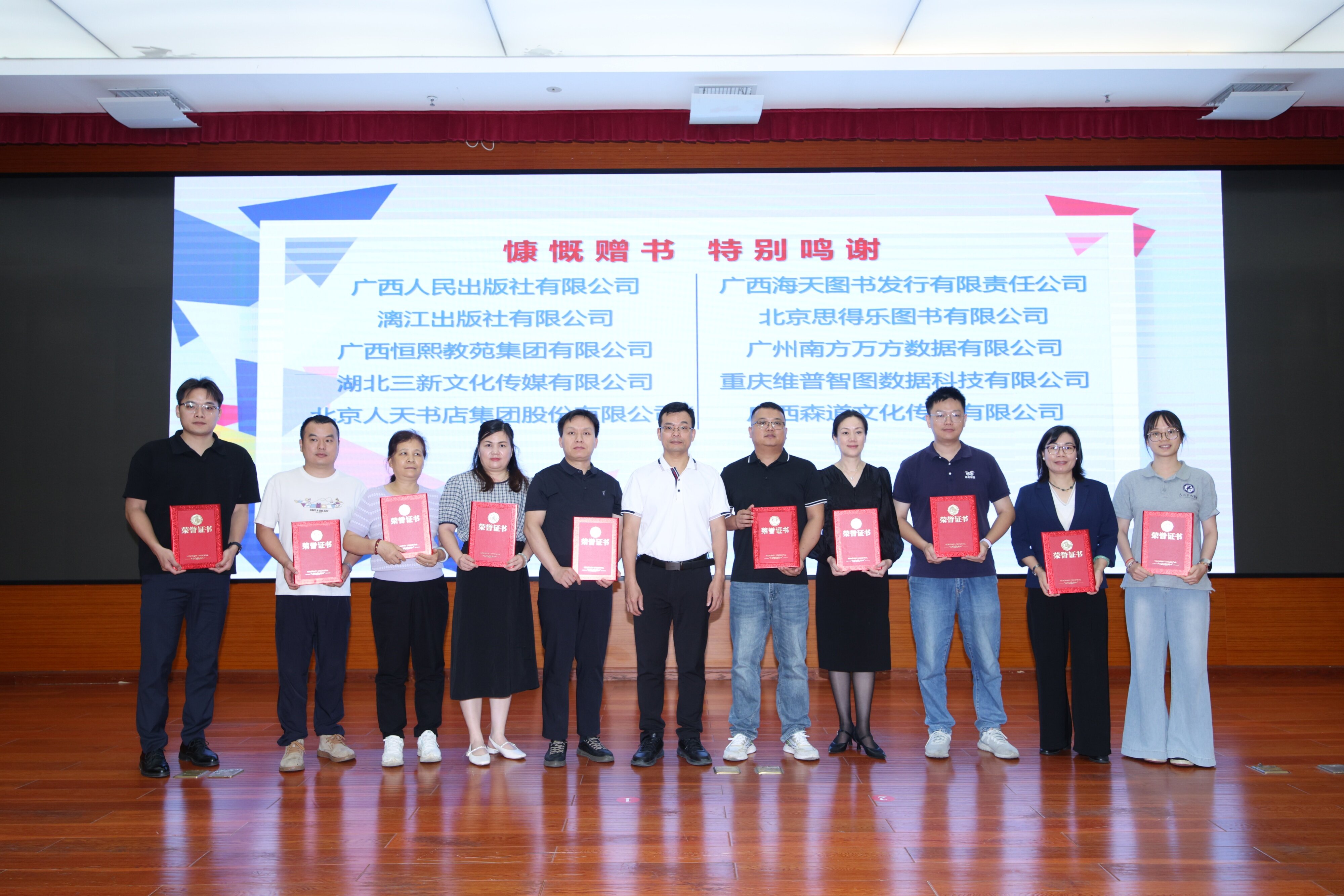 活动现场举行了图书捐赠仪式。广西人民出版社有限公司、漓江出版社有限公司、广西森道文化传播有限公司、广西恒熙教苑集团有限公司等10家企业代表共向学校捐赠价值近10万元的图书,为学校丰富馆藏资源、拓宽师生阅读视野提供了有力支持。李东升代表学校接受企业捐赠,并向企业代表颁发捐赠证书。