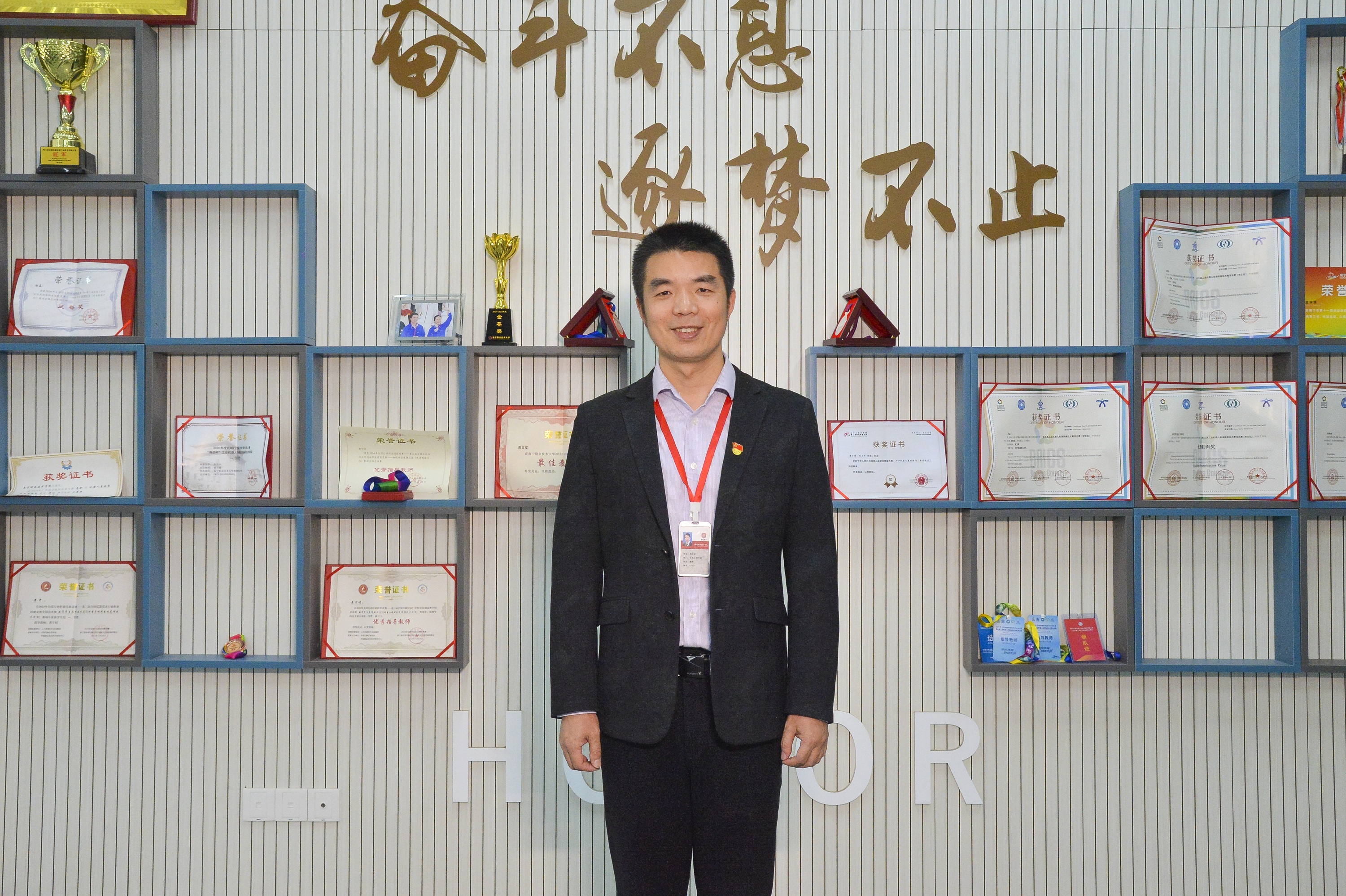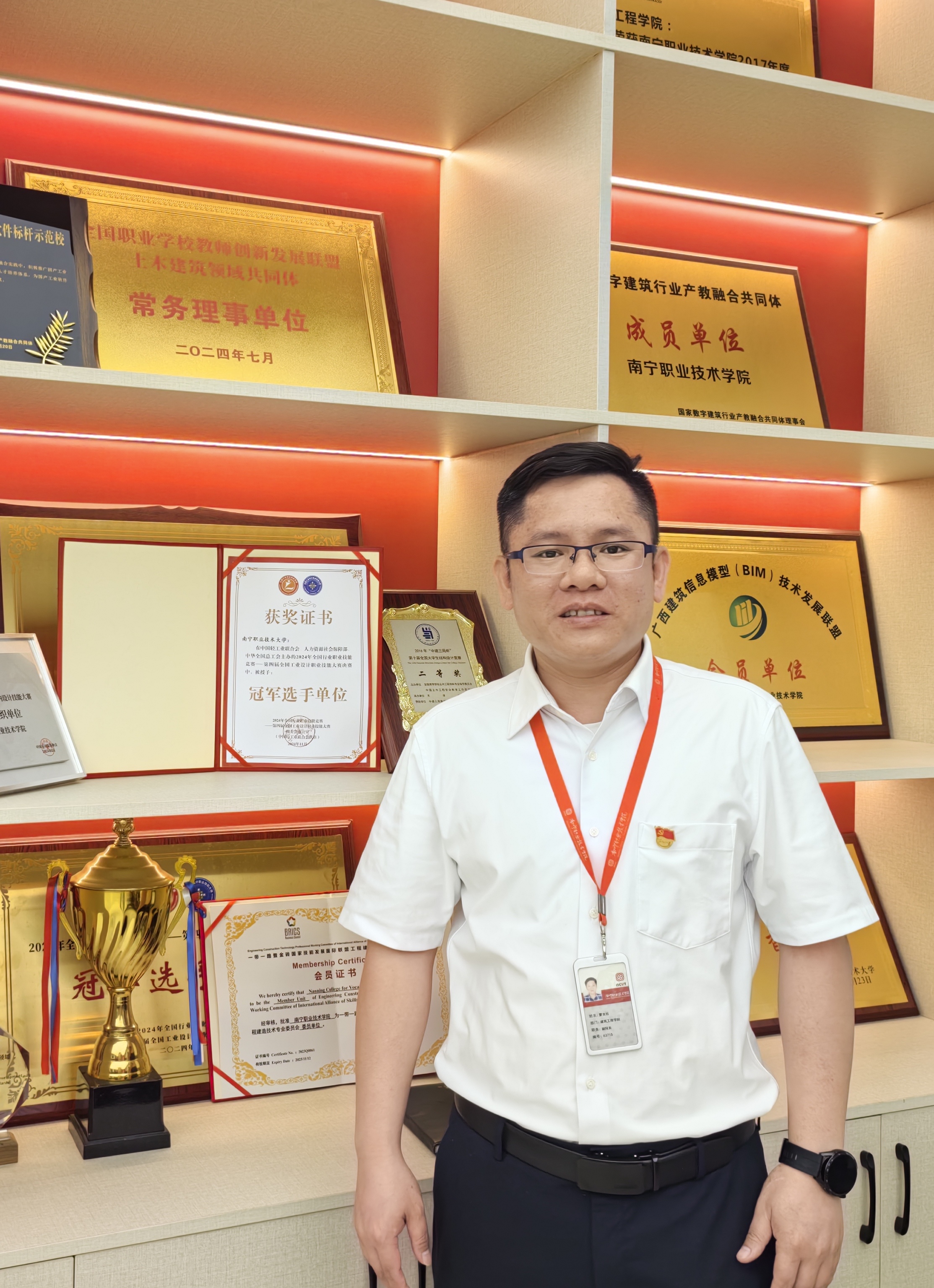 蒙良柱,中共党员,副教授、高级工艺美术师。先后荣获国家级课程思政教学名师、全国轻工技术能手等荣誉称号,系国家“工匠之师”德国访问学者、国家级职业教育教学创新团队成员、自治区级黄大年式教学团队成员。2024年,在全国行业职业技能竞赛——第四届全国轻工业设计职业技能大赛决赛中荣获室内装饰设计师赛项职工组一等奖,斩获全国冠军。从教11年来,他始终坚守“技能报国、育人为本”的初心使命,践行特色育人理念,深耕职业教育教学一线,以务实作风服务社会发展,以专业能力赋能技能人才培育。他创新构建“岗课赛证”育人模式,积极探索“教学-竞赛-实训-就业”一体化发展路径,牵头推进教学创新与资源升级,主编《公共空间数字化设计》等特色教材3套,成功研发18项实用新型专利、外观专利及软件著作权。他创新提出“教-赛-研-服”四维成长体系,全力打造一支适配产业发展、兼具教学与实践能力的高水平“双师型”师资队伍。他主持及参与7项省部级、市厅级课题研究,发表学术论文12篇,累计指导师生斩获各级各类奖项50余项,培养高素质技能人才近2000人,主导制定老挝国家职业标准、推动中国职教标准走向国际,深耕乡村振兴与产业工人技能提升培训,以实干担当践行新时代职教人的使命。