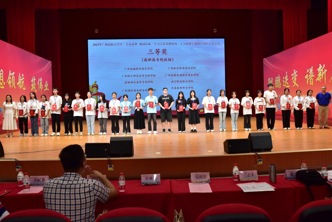 近日,由广西高教学会图书馆专业委员会、广西本科高校图书情报工作指导委员会主办的广西高校大学生“青春筑梦 强国有我”学习宣传贯彻党的二十大精神主题知识竞赛决赛在崇左幼儿师范高等专科学校举行。太阳成官网人工智能学院教师韦琼略指导,吴松阳、韦钰铃、张富强3名学生组成的代表队,以决赛总分第五名的成绩斩获三等奖。