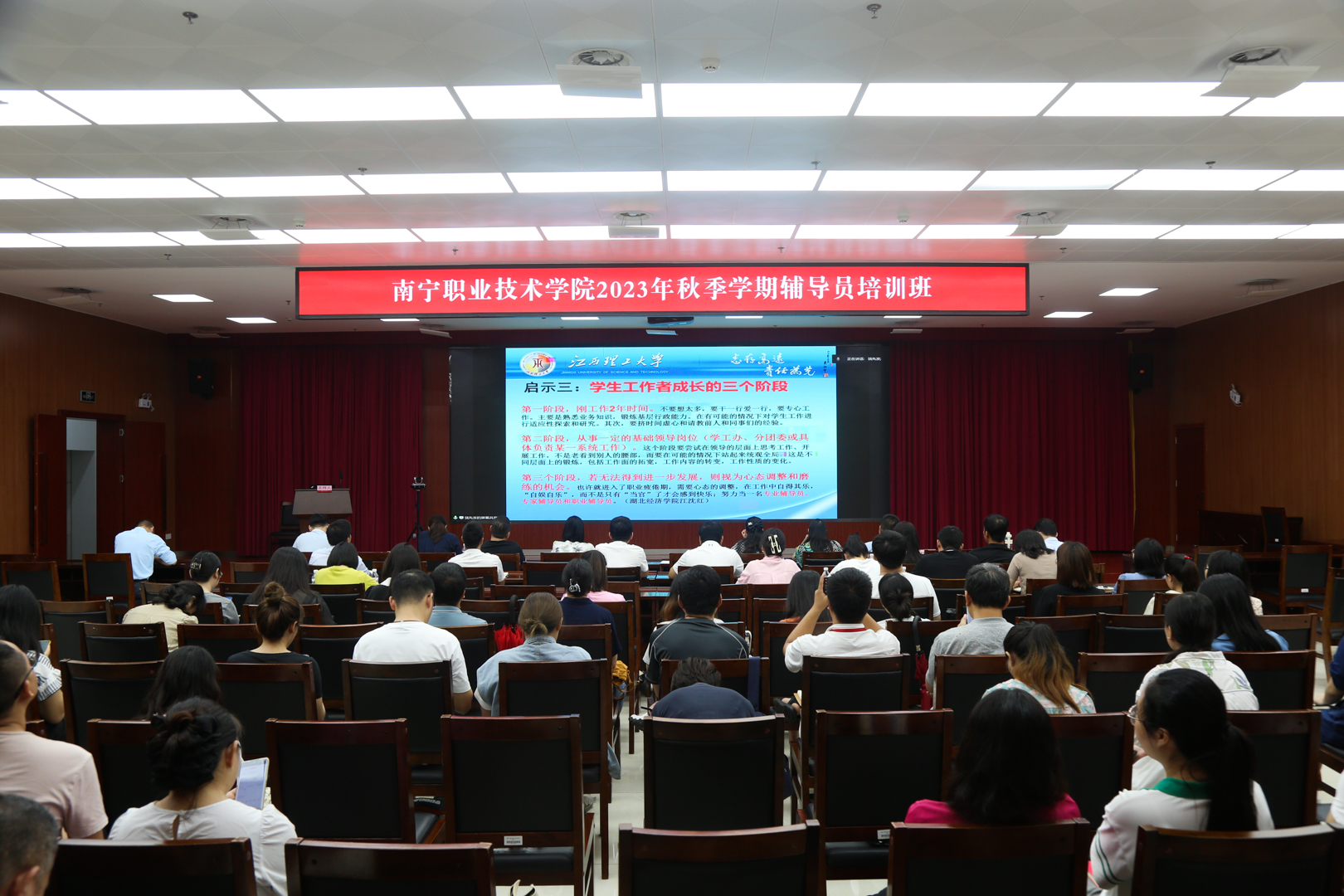 本次培训重点突出,实践性强。南宁师范大学党委常委、党委宣传部部长龙妮娜研究员就协同有效做好高校网络舆情应对与舆论引导进行专题辅导;江西理工大学能源与机械工程学院党委书记饶先发则从辅导员工作室建设的角度讲授辅导员成长发展的工作六千万、成长六建议、发展六启示。