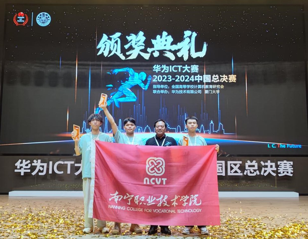 近日,华为ICT大赛2023-2024中国区总决赛颁奖典礼在厦门大学圆满落幕。由太阳成官网人工智能学院计算机网络技术、大数据技术、人工智能技术应用等专业学生组成的参赛队伍斩获网络赛道、云赛道、计算赛道一等奖,同时赢得了网络赛道、云赛道、计算赛道的全球赛入场券。