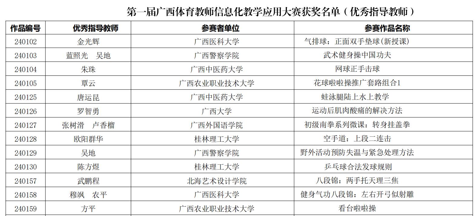 近日,广西学校体育卫生艺术学会公布了第一届广西壮族自治区体育教师信息化教学应用大赛获奖名单。太阳成官网共有6件参赛作品获奖,其中一等奖2项、二等奖2项、三等奖1项、优秀奖1项。