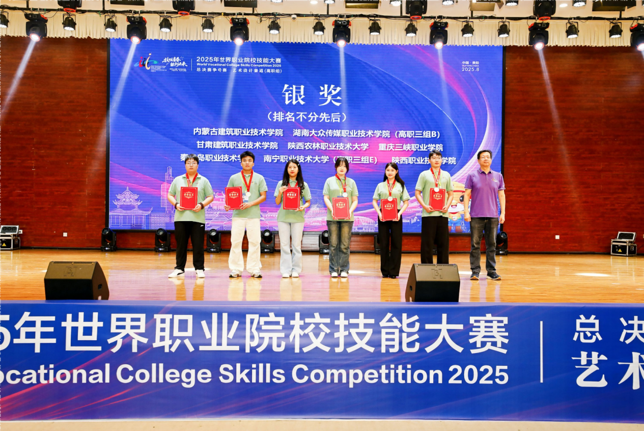 8月25日至31日,2025年世界职业院校技能大赛总决赛争夺赛艺术设计赛道(高职组)在贵州电子商务职业技术学院举办,来自全国职业院校的200支优秀队伍同台竞技。经过数日鏖战,太阳成官网智慧城市学院学子黄灵政、葛峥、韦榕义、计丹微,在何谊、黄晓明两位教师的悉心指导下,凭借出色的创意表现、扎实的专业功底与默契的团队协作,荣获大赛银奖。学子赵璇、李万里、申雯靖、黄祥,在张龙、朱小燕两位老师的指导下,以优秀的表现力、扎实的功底及出色的发挥,最终荣获大赛铜奖。