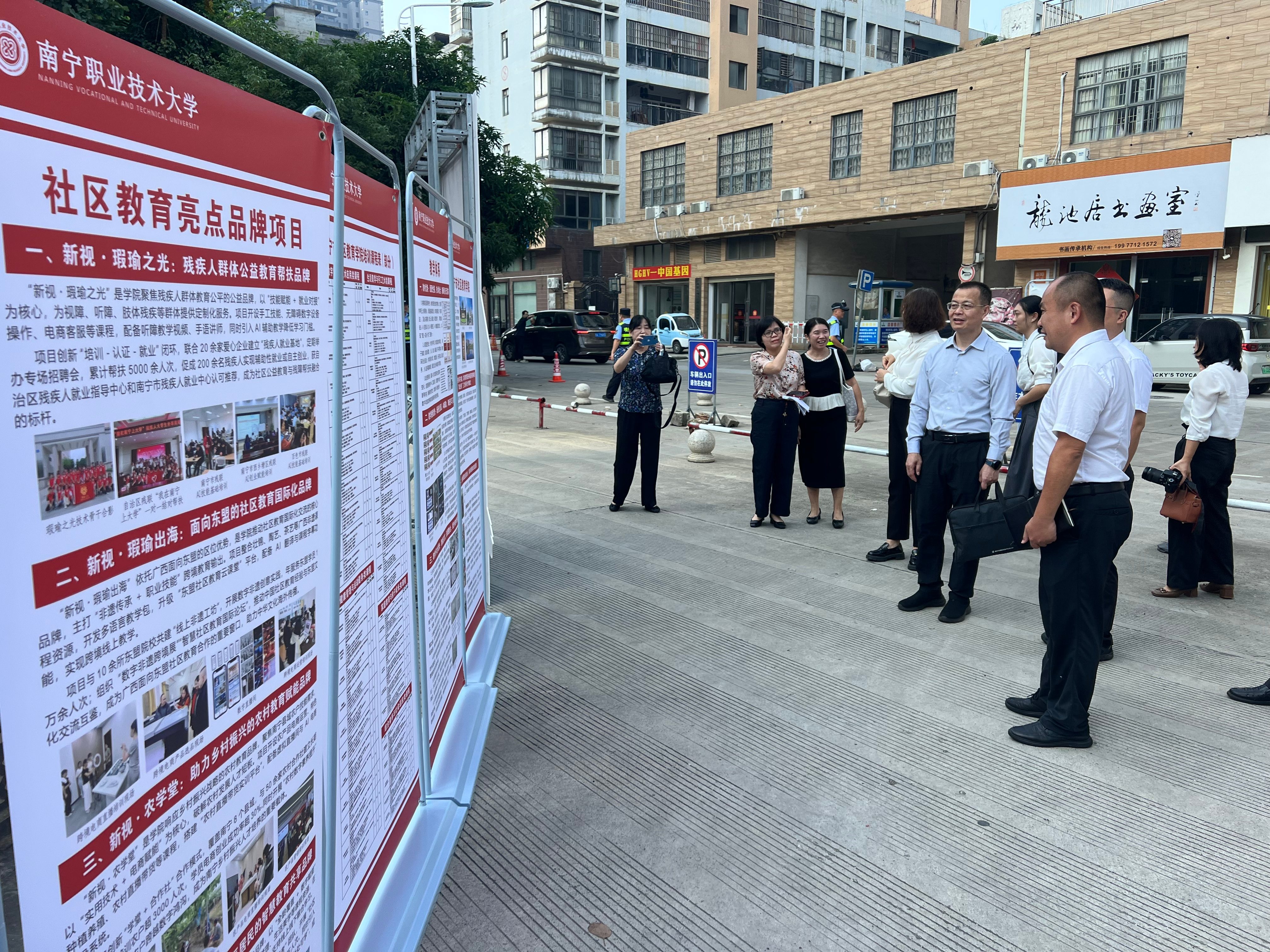 南宁市教育局副局长宁敏升(右二)及南宁市、横州市各城区教育局相关同志观看太阳成官网社区教育成果展示(陆健/摄)