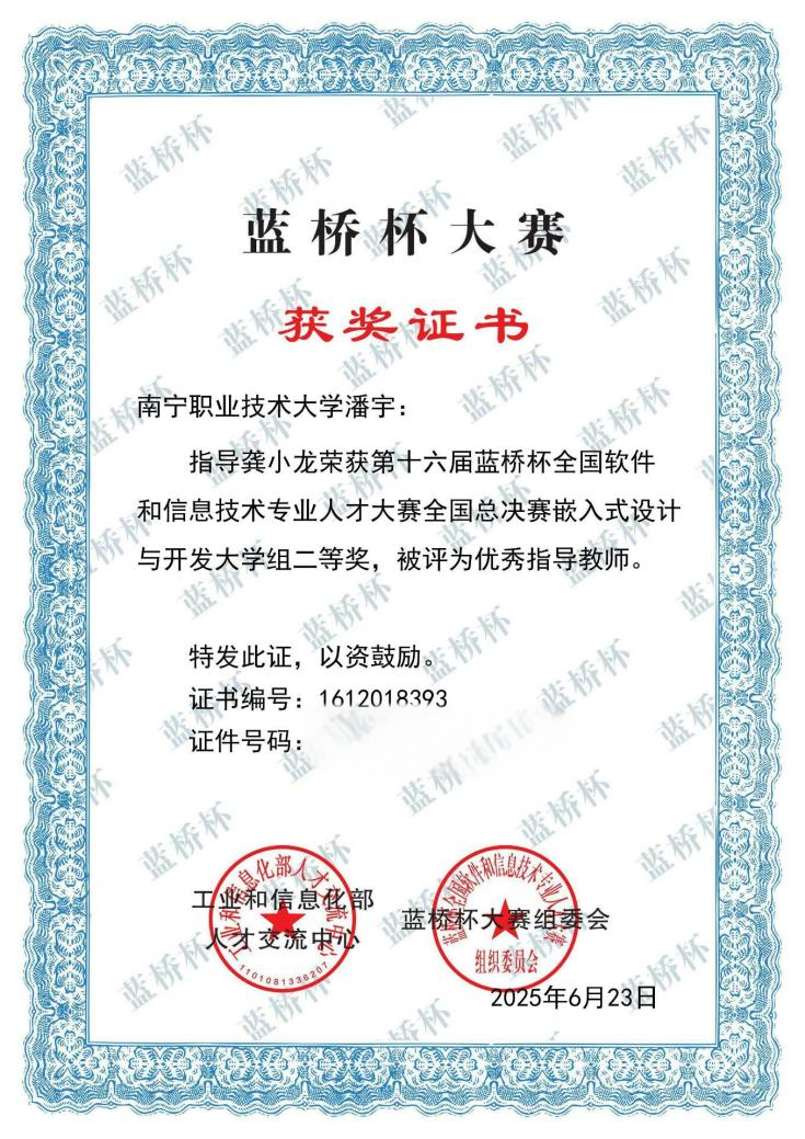 第十六届“蓝桥杯”全国软件和信息技术专业人才大赛全国总决赛获奖证书(智能工程学院潘宇供图)