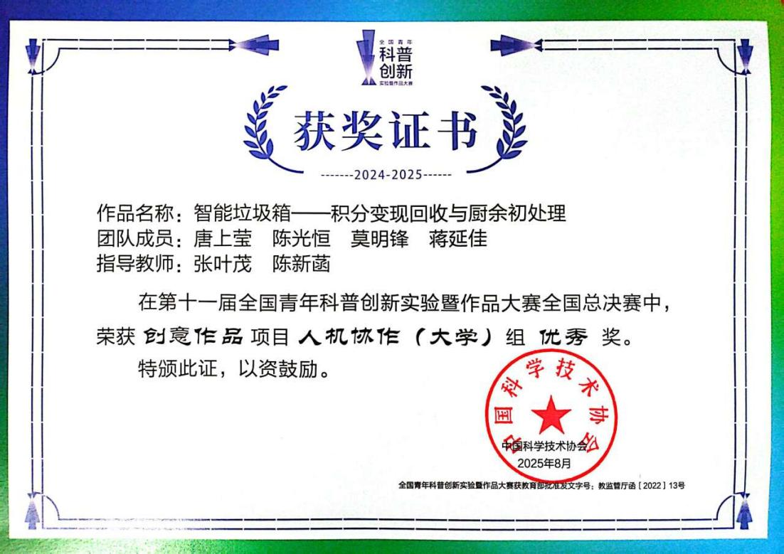 第十一届全国青年科普创新实验暨作品大赛获奖证书(智能工程学院潘宇供图)
