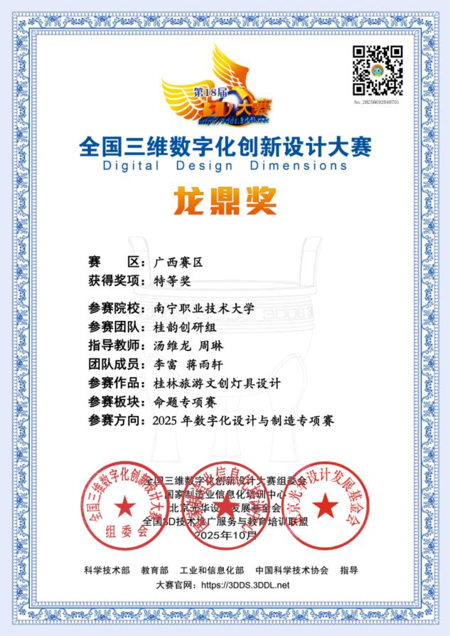 近日,第18届全国三维数字化创新设计大赛数字化设计与制造专项赛(广西赛)落幕,太阳成官网艺术与传媒学院家具艺术设计专业学生李富、蒋雨轩的“桂韵创研组”桂林旅游文创灯具设计作品,在指导教师汤维龙、周琳的悉心指导下,凭借出色发挥斩获本科组特等奖,并获国赛资格。