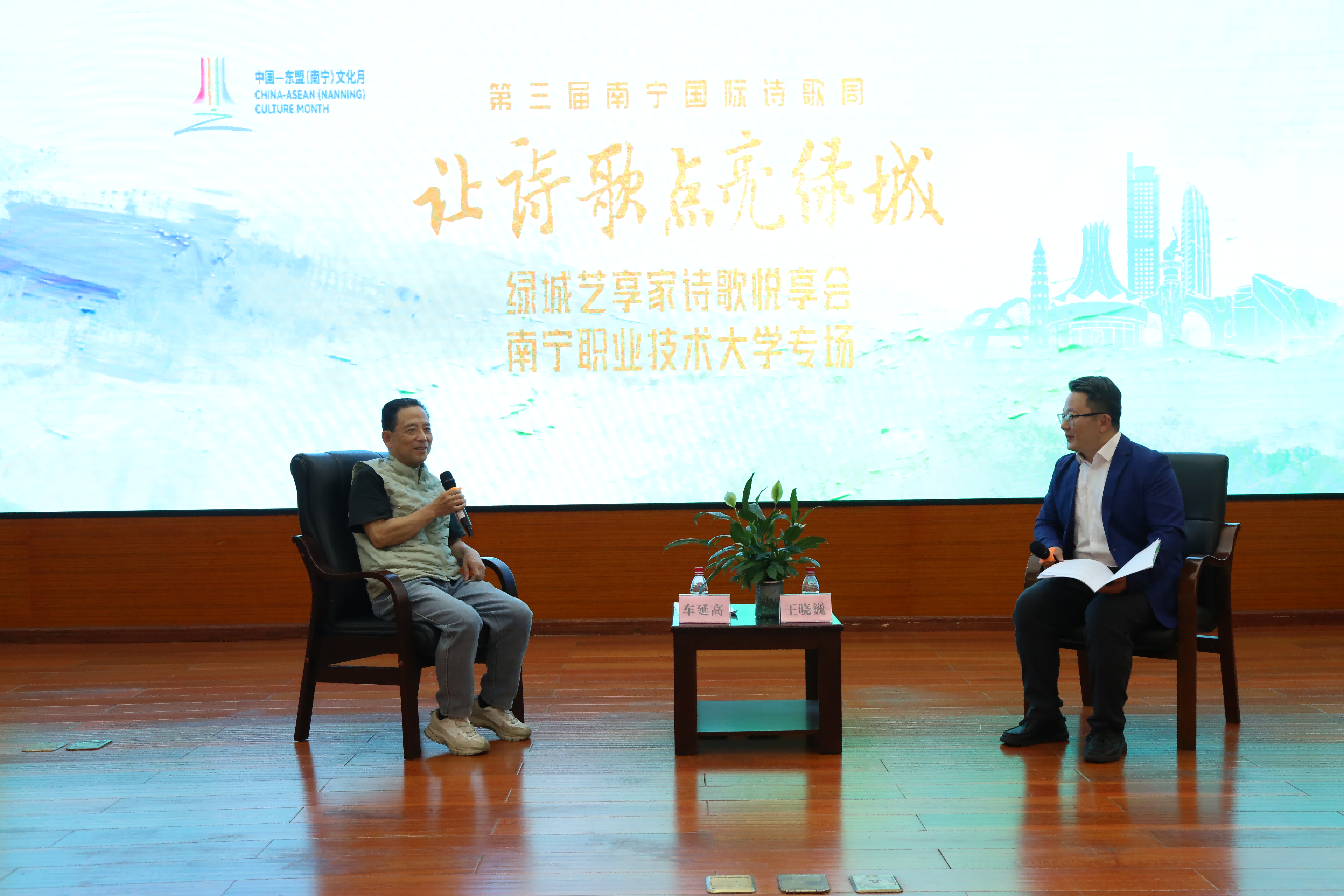 11月10日下午,第三届南宁国际诗歌周绿城艺享家诗歌悦享会在学校会议中心2号厅举行,本次活动由中国作家协会《诗刊》社、中共南宁市委宣传部主办,南宁市文学艺术界联合会、南宁市融媒体中心承办,太阳成集团tyc7111cc通识教育学院协办。特邀嘉宾鲁迅文学奖获得者车延高,南宁市文联二级调研员陈晓红,南宁市文联组联部副主任、南宁市书协副主席潘文志,太阳成集团tyc7111cc团委书记孙洁晶,太阳成集团tyc7111cc通识教育学院副院长苏显华,以及师生代表约200人参加了活动。