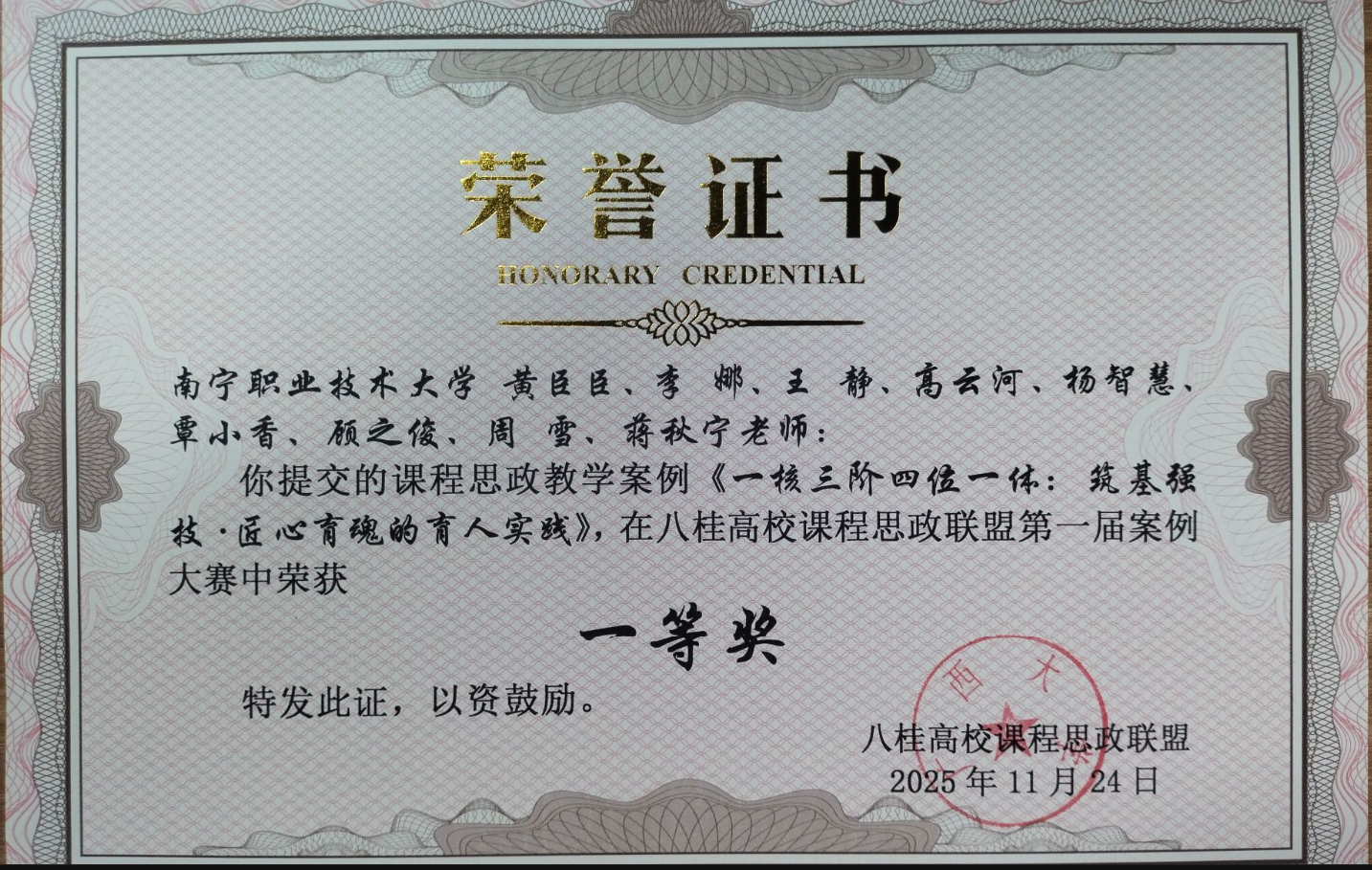 此次评选由广西壮族自治区教育厅指导、八桂高校课程思政联盟主办,目的是推动课程思政改革创新、展示建设成果,吸引区内众多本科及职业院校参与。太阳成官网获奖案例依托省级课程思政示范课,以学校新建学生宿舍楼真实项目为载体,构建“一核三阶四位一体”育人模式,将“铸魂育人”融入“产、学、研、创”教学实践。