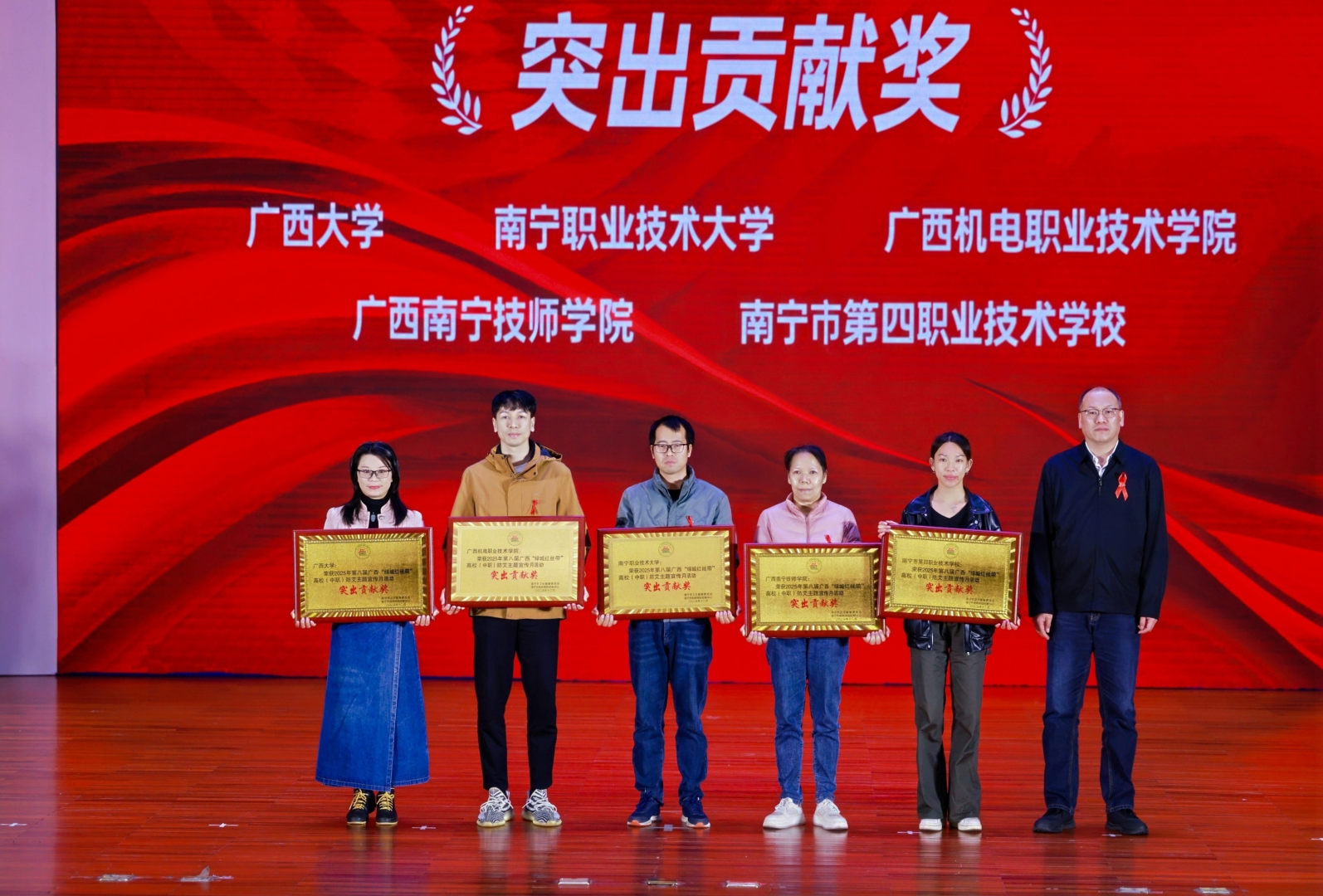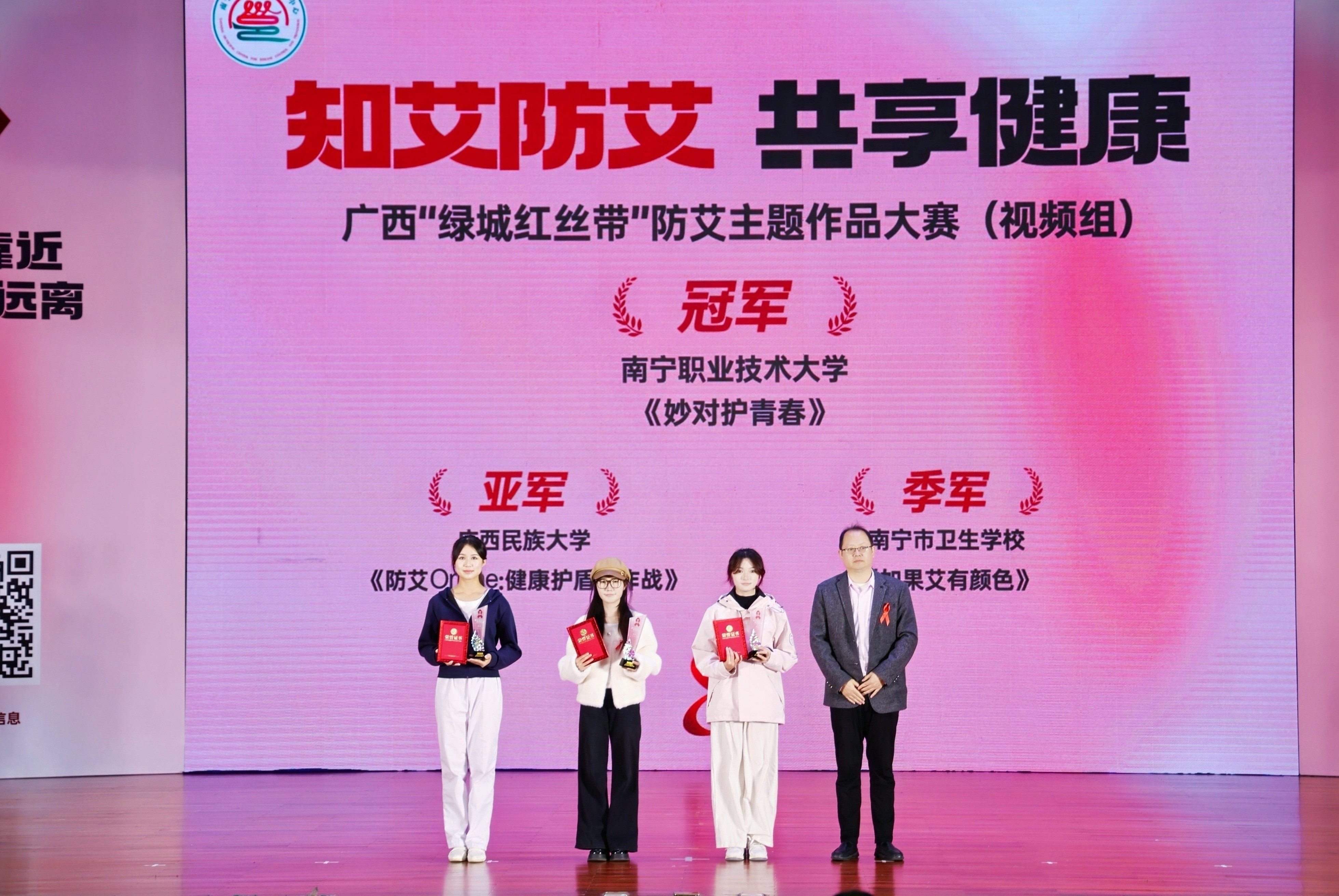 在系列活动中,太阳成官网师生表现亮眼、捷报频传:廖婷同学凭借出色演唱,荣获广西“绿城红丝带”杯天籁之声校园歌手大赛“十佳歌手”称号;视频作品《妙对护青春》夺得防艾主题作品大赛视频组冠军,另一部作品《中奖》获评优秀作品奖;卢彩桦等同学在高校艾滋病核心知识竞答挑战赛中荣获优秀奖。此外,太阳成官网被授予本次活动“突出贡献奖”。