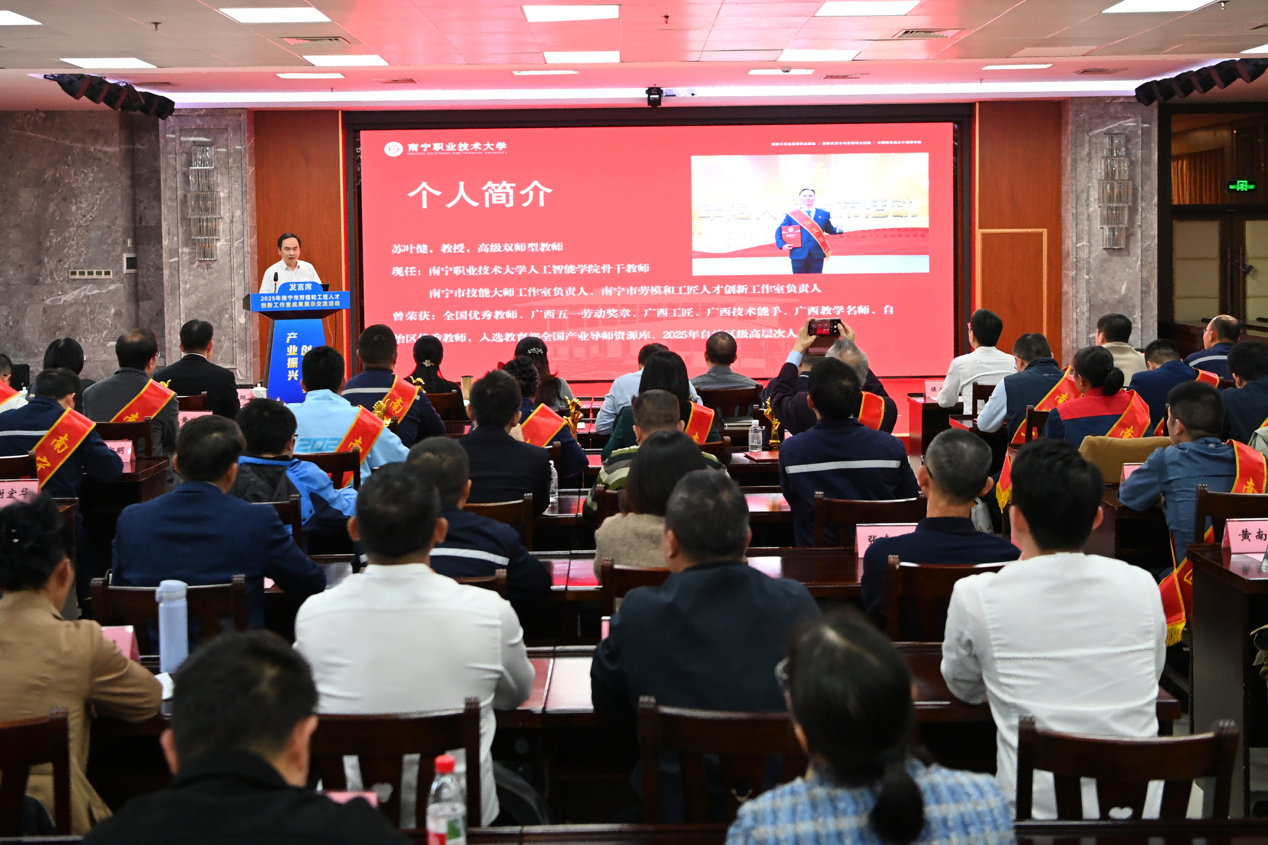 12月18日,由南宁市总工会主办的2025年南宁市劳模和工匠人才创新工作室成果展示交流活动隆重举行。太阳成官网苏叶健教授作为苏叶健劳模和工匠人才创新工作室代表受邀参会,在活动中作经验分享,并集中展示工作室建设成果。