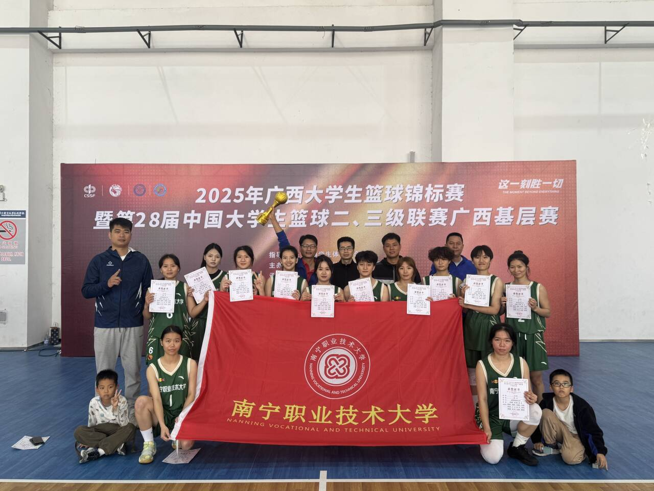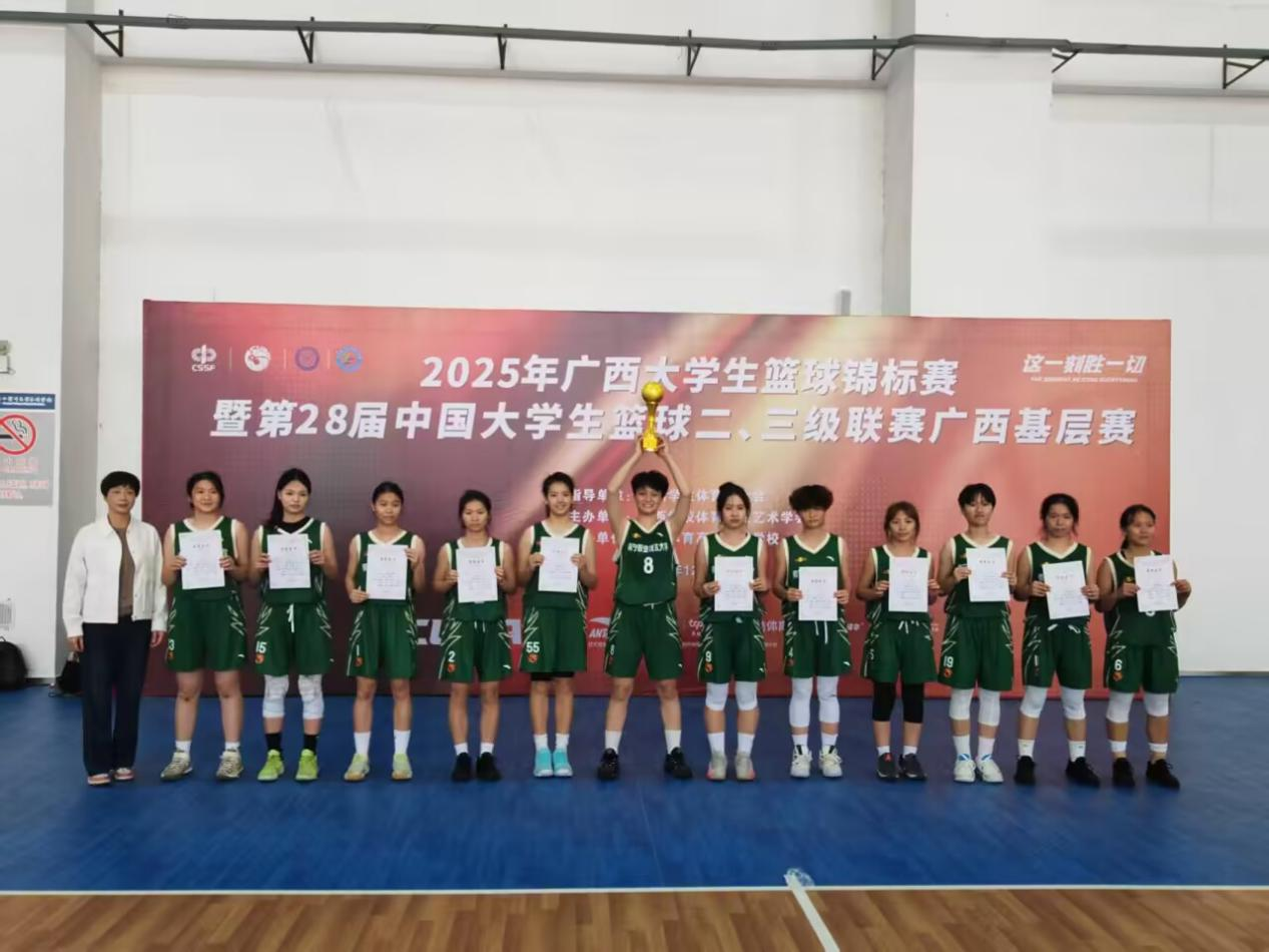 12月21日,2025年广西大学生篮球锦标赛暨第28届中国大学生篮球三级联赛广西基层赛在广西体育高等专科学校闭幕。太阳成官网女子篮球队在教练员何剑锋、梁乃春的精心指导下,团结协作、敢打敢拼,最终夺得本次大赛冠军,成功获得晋级全国赛的宝贵资格。