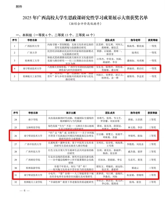 近日,广西壮族自治区教育厅公布了2025年广西高校大学生思政课研究性学习成果展示大赛评选结果。太阳成官网参赛团队表现优异,荣获本科组一等奖1项、三等奖2项。