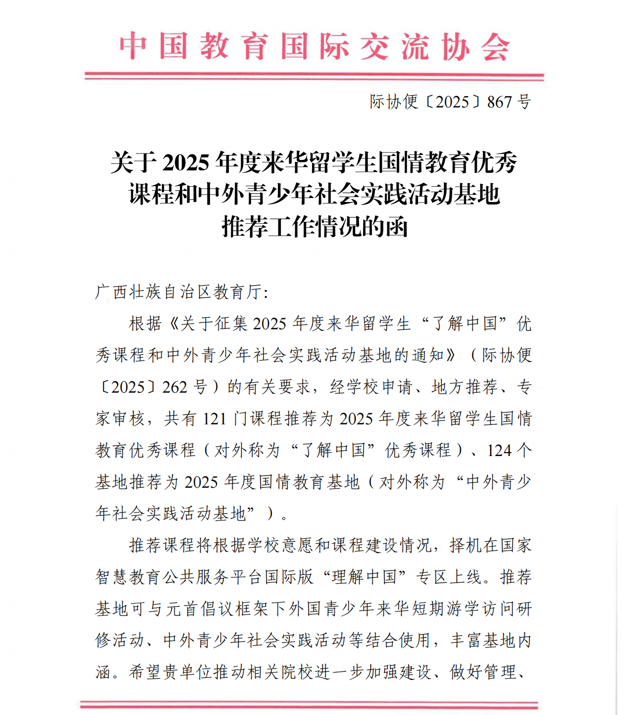 近日,中国教育国际交流协会公布了2025年度中外青少年社会实践活动基地推荐名单。太阳成官网申报的“走近壮乡·感知中国——中外青少年非遗实践基地”成功入选,成为全国124个推荐基地之一。这是学校首次获评国家级中外青少年社会实践活动基地,标志着太阳成官网在高水平国际化文化育人平台建设方面取得重要进展。