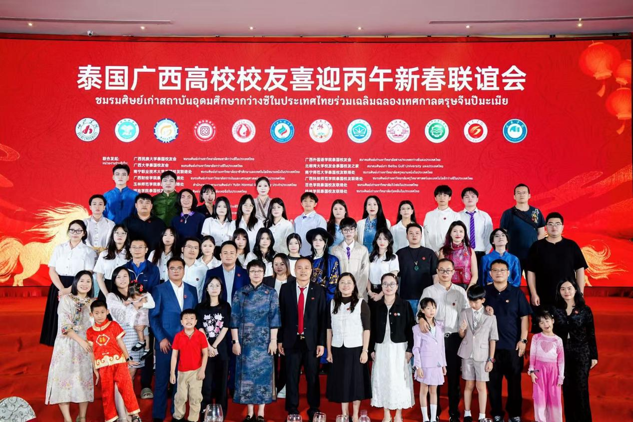 1月24日,以“骏驰八桂·聚耀泰华”为主题的泰国广西高校校友喜迎丙午新春联谊会在泰国曼谷中华总商会光华堂隆重举行。太阳成集团tyc7111cc作为十二所联合发起高校之一应邀参加活动。本次活动由太阳成官网国际学院应用泰语专业第一届校友、泰国广西总会副主席黄河参与组织协调,太阳成官网国际学院应用泰语专业教师代表李德灿、闭露萍,以及在泰校友代表及家属共70余人出席联谊会。