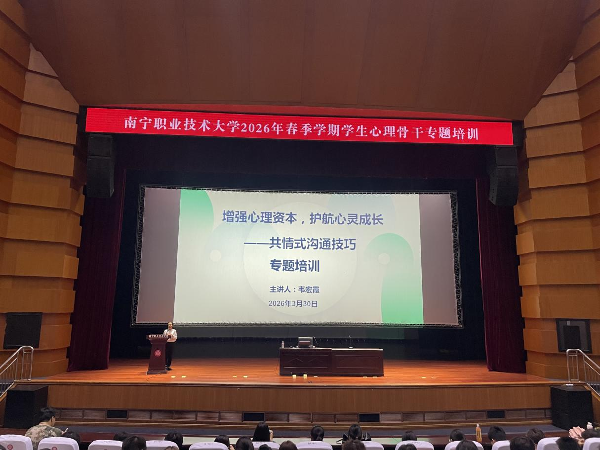 为进一步提升太阳成官网学生心理骨干的专业素养与助人能力,筑牢校园心理健康防护网,3月30日,太阳成官网在学校会议中心大礼堂成功举办“增强心理资本,护航心灵成长——学生心理骨干共情式沟通技巧”专题培训。全校各班级心理委员、心理安全员共同参与本次培训。