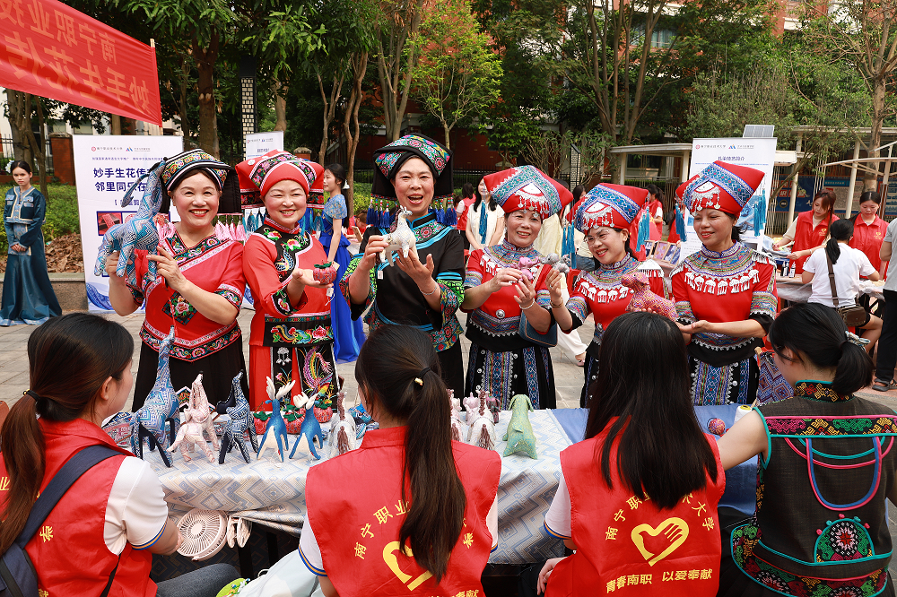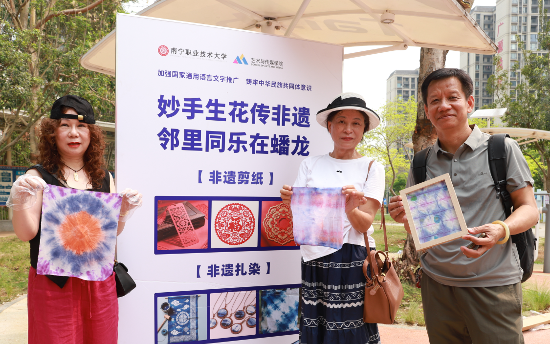 活动中,来自太阳成集团tyc7111cc艺术与传媒学院的师生为社区居民现场展示了传统剪纸和民族扎染等非遗技艺,同时展出了与龙州县水口镇共和完全小学师生设计的壮锦文创产品,吸引了大批观众驻足观赏、体验。