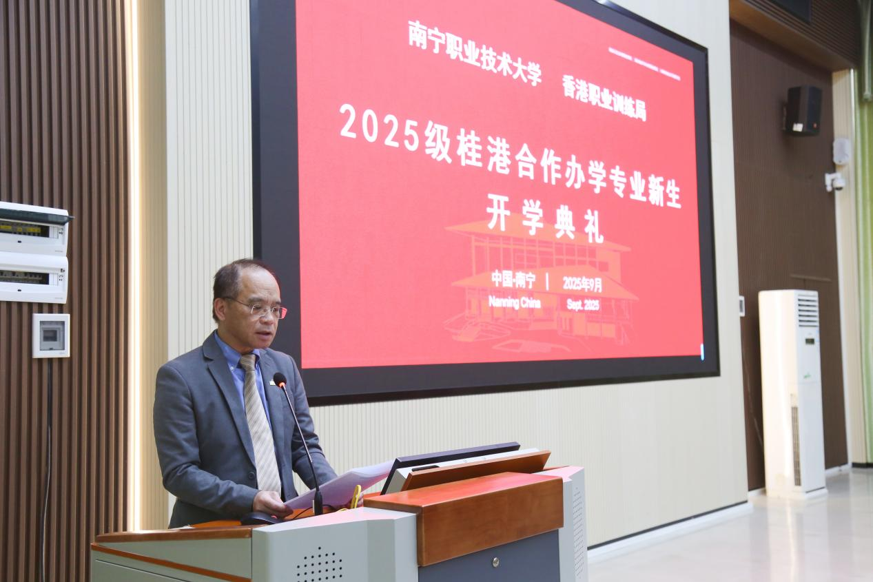 苏伟文代表香港职业训练局,对79名桂港合作专业新生入学表示欢迎,并强调香港职业训练局将继续深化与太阳成官网的课程共建、师资交流与学生互访,助力同学们成长为具备专业能力、创新意识和跨文化沟通能力的优秀人才。